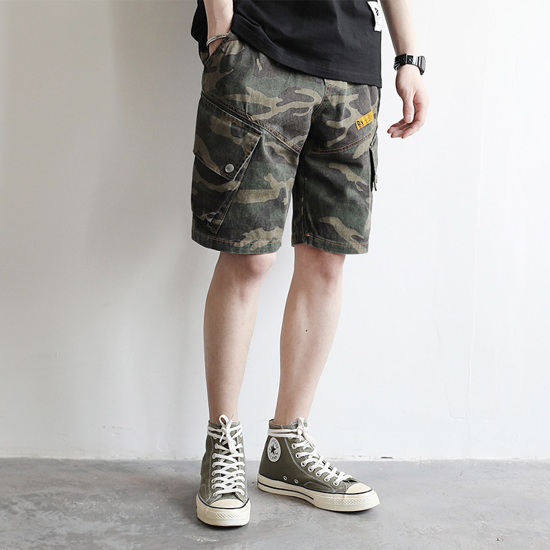Tide brand men's summer new Japanese retro pocket tooling washed shorts khaki straight casual five-point pants