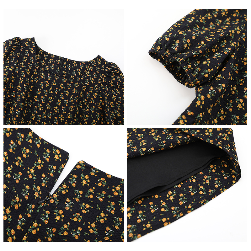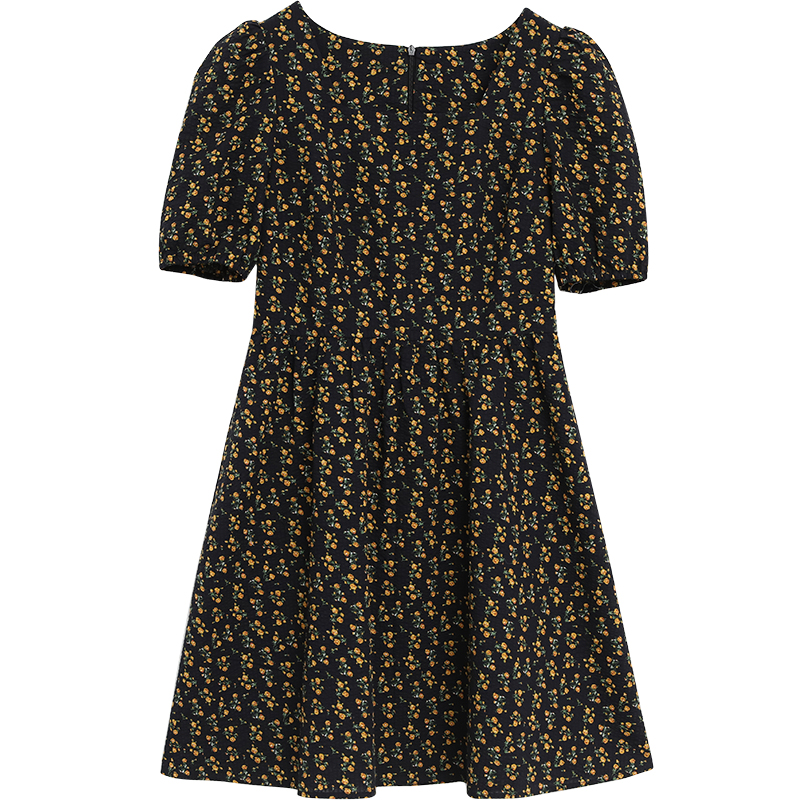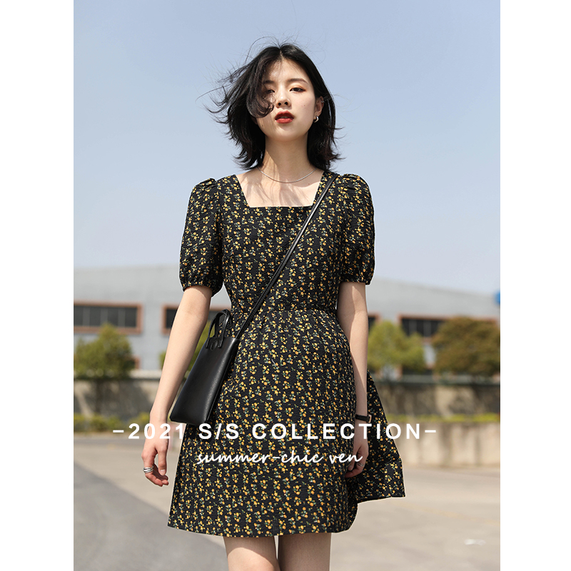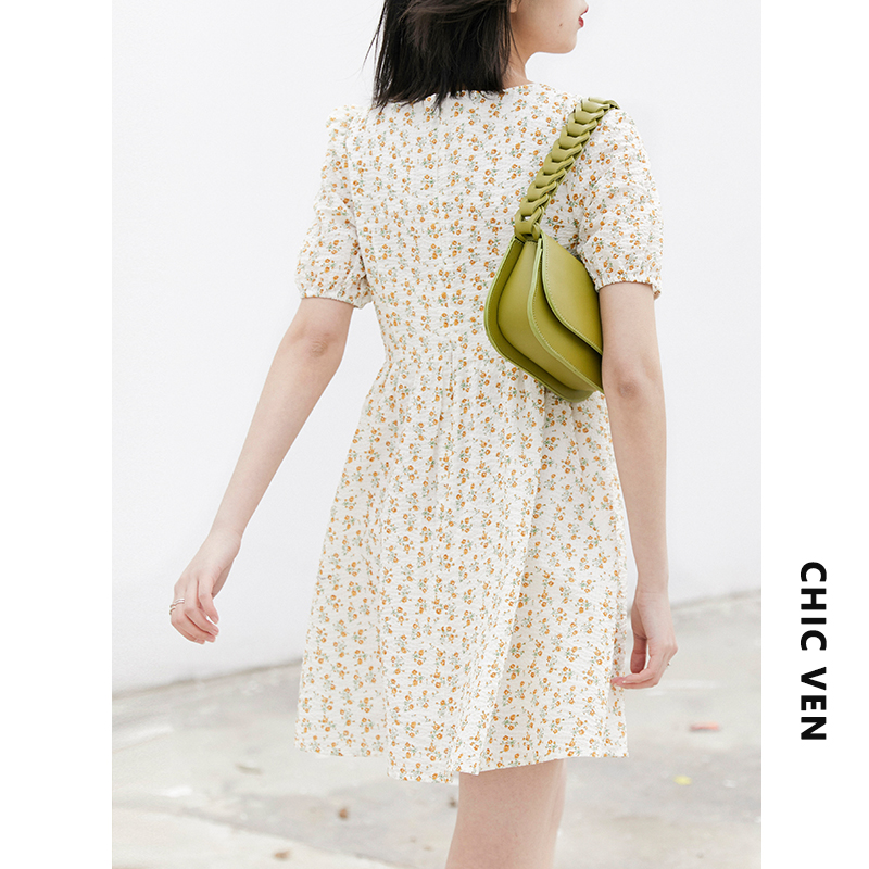 CHICVEN "Daylight Allure" vintage French square neck puff sleeve floral dress short sleeves thin skirt summer