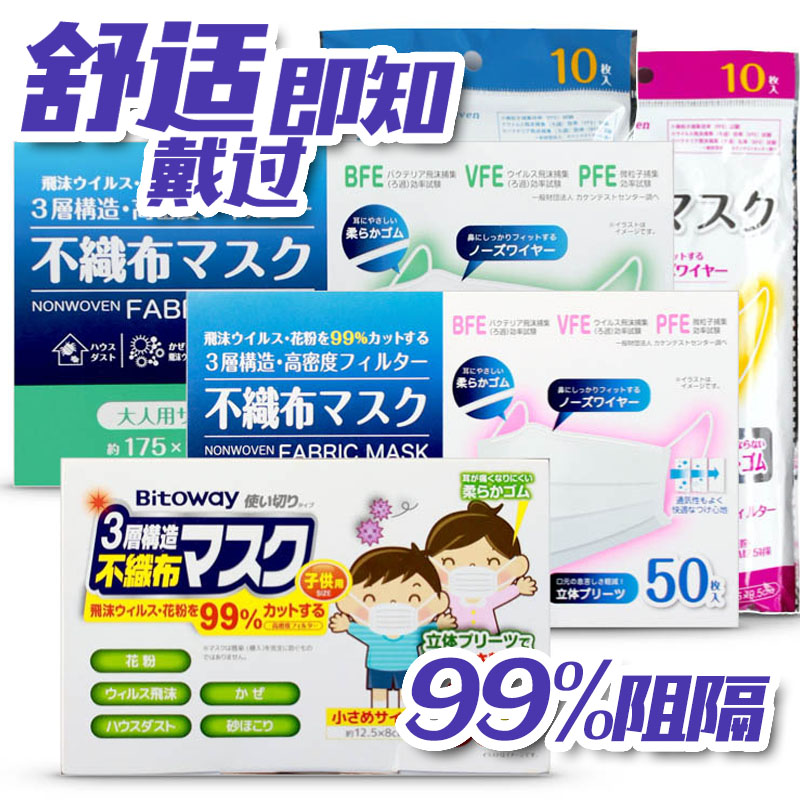 It is comfortable to wear and exported to Japan for sale in Japan with 3 layers of non-woven cloth protective bitoway masks for adults and children vfe filter bfe