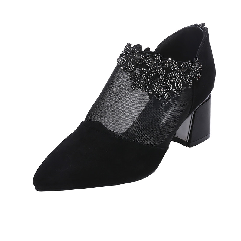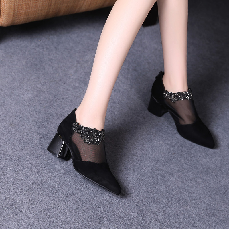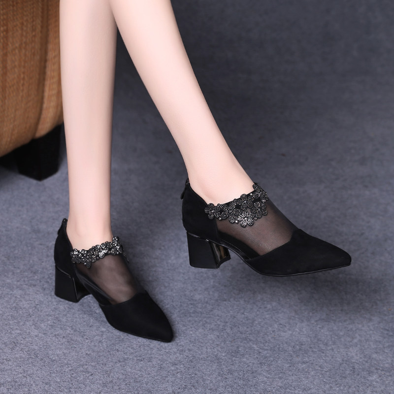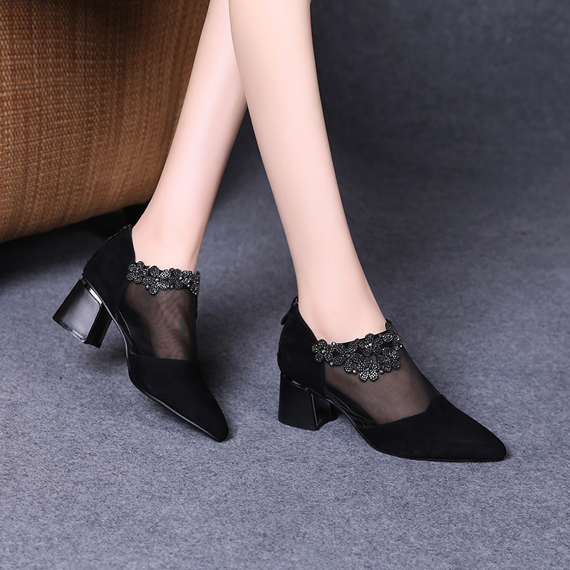 2022 new spring summer hollowed-out women's shoes summer style coarse heel single shoe female mesh yarn high heel shoe soft leather with real leather shoes