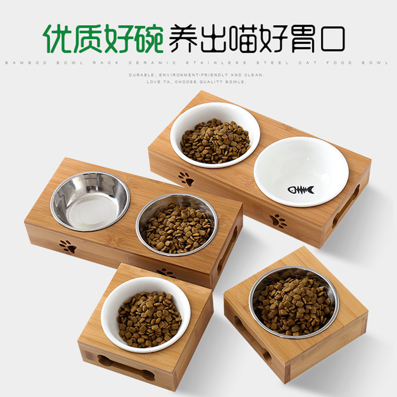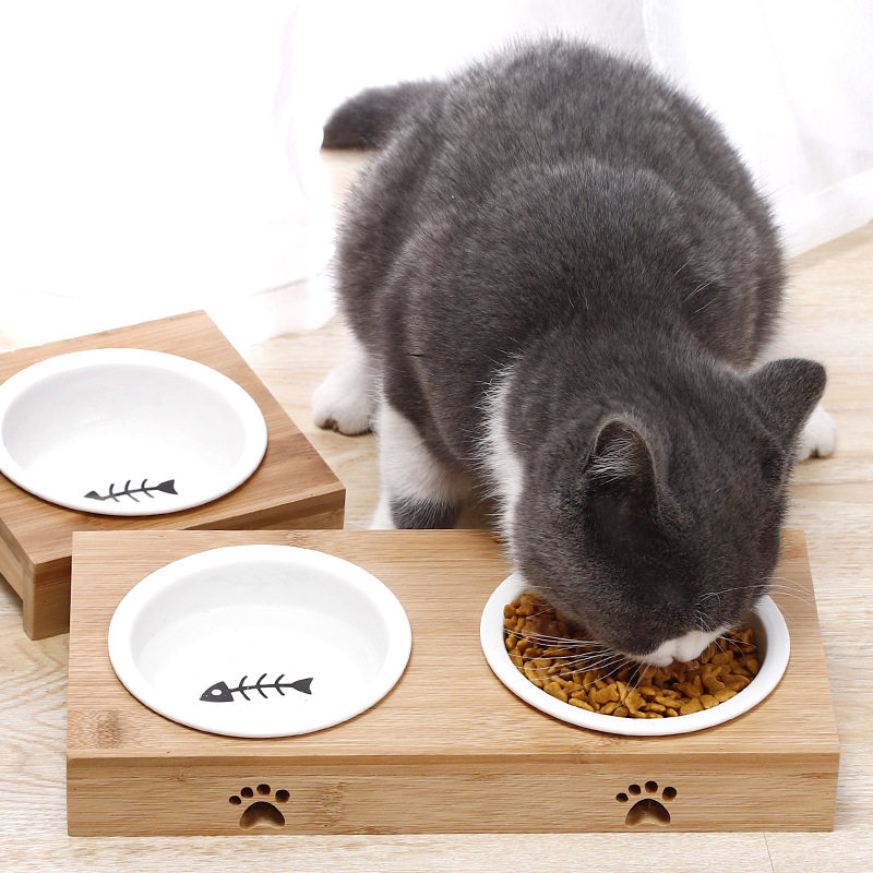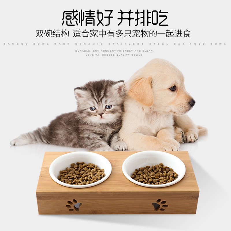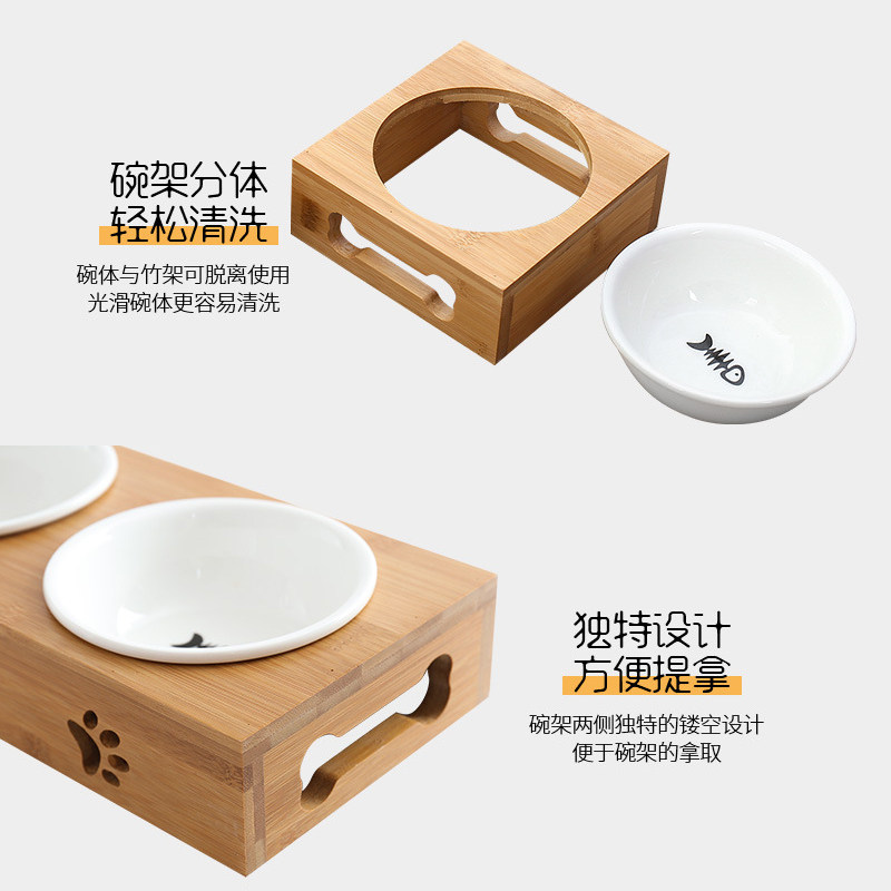 Cat Bowl Ceramic Double Bowl protection cervical spine Anti-turning wood Bowl Rack Cat Food Basin Dogs Drink Water Bowls of Pet Supplies