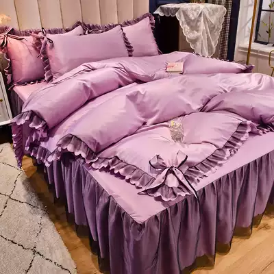 Summer double-sided ice silk four-piece bed skirt style Princess style bed real silk tencel smooth nude sleeping quilt cover solid color