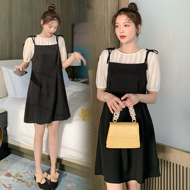 Summer maternity dress large size women's thin chiffon short sleeve sundress two-piece set net red style Western style dress