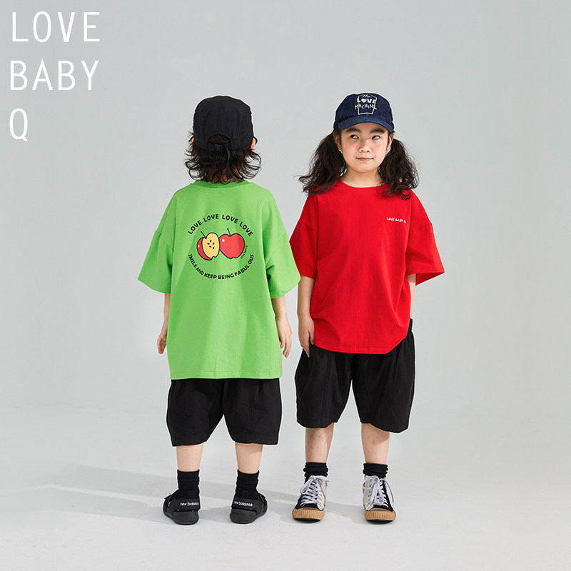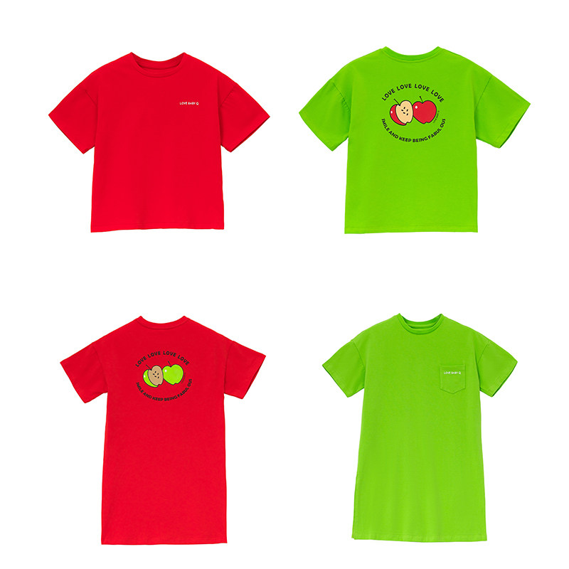 Red T-shirt Children's section Green T-shirt Children's red T-dress Children's section Green T dress Children's red T-shirt Adult with green T-shirt Adult