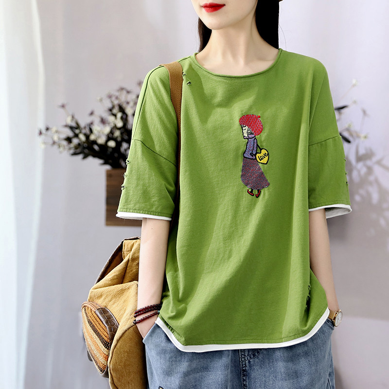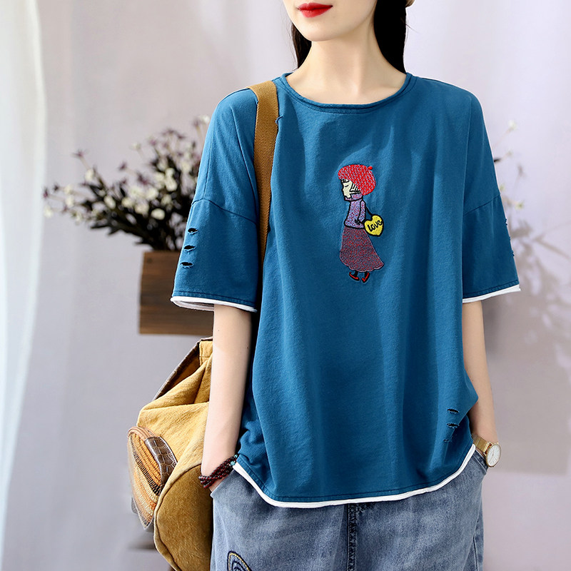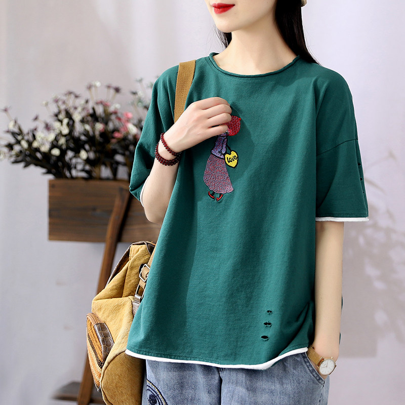Hanso Yi Red Han Fan Summer Red Hat embroidery design of girls short sleeve T - shirts relaxed leisure round collar coat