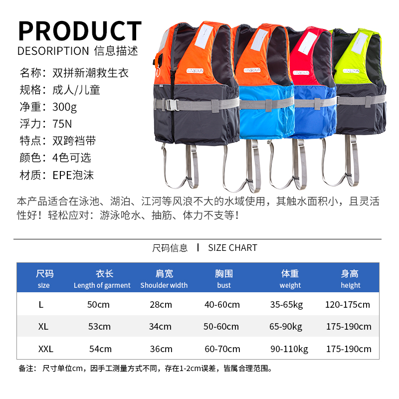 Larry orange gray Larry orange blue Larry red blue larry fluorescent green gray L(for 70-120 pounds) XL(for 120-170 pounds) XXL(for 17