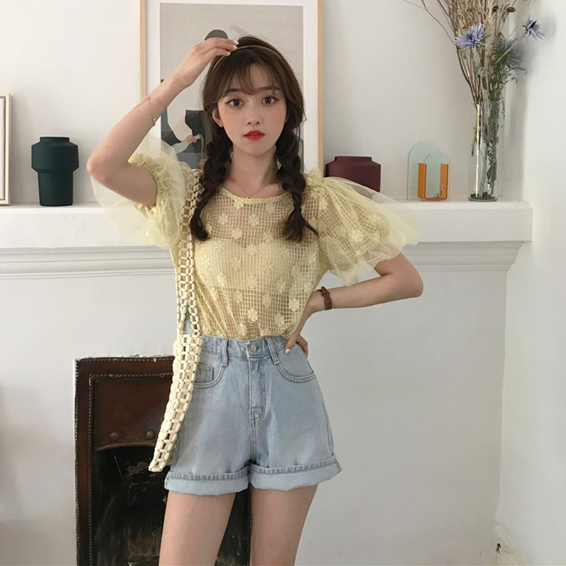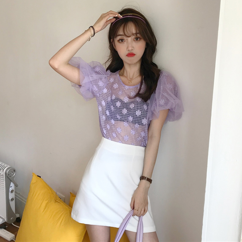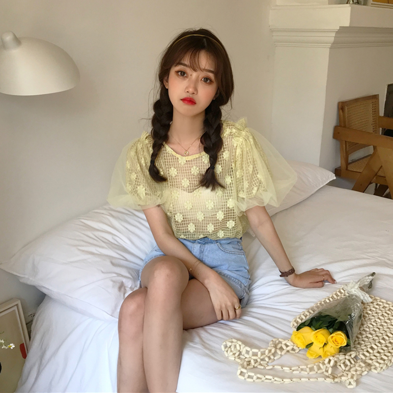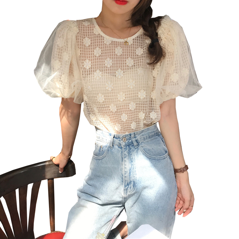 Small fresh mesh stitching puff sleeve lace shirt women's summer design sense openwork hook flower wild age reduction micro-permeable blouse