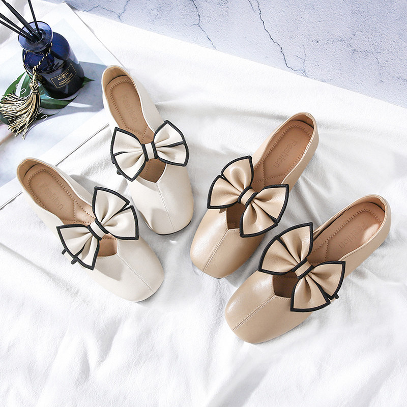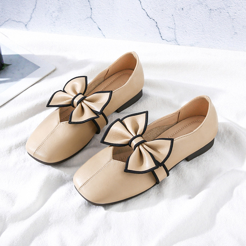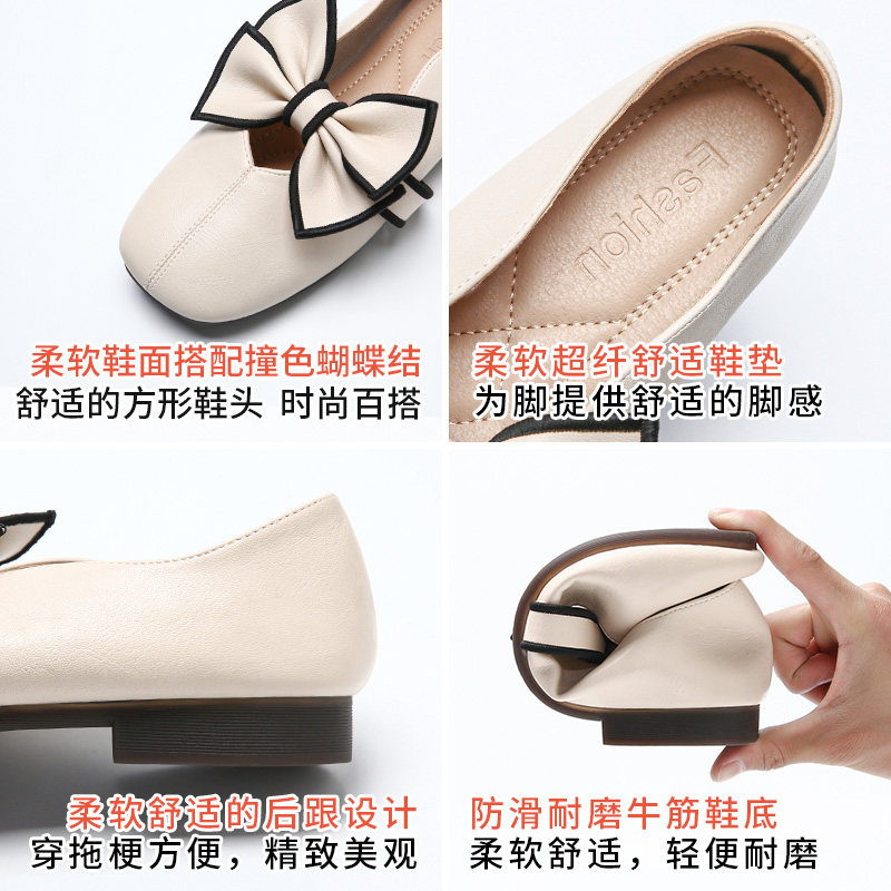 Square Head Shoes Women Genuine Leather 2022 New Summer Bow Tie Gentle Flat Base Bean Bean Shoes Soft Bottom Light Mouth Women's Shoes