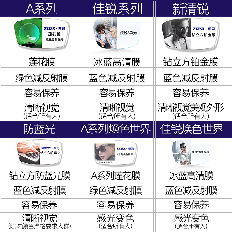 ZEISS Vision Resistant HD Film (2 pieces) ZEISS Vision Blue Light Resistant Film (2 pieces) ZEISS Vision Resistant To Discoloration (2 pieces) ZEISS Jiarui HD Ice Blue Film (2 pieces) ZEISS Series Lotus Film (2 pieces) ZEISS New Sharp Drill Cubic Platinum Film (2 pieces) ZEISS Drill Cube Blue Light Protection Film (2 pieces)