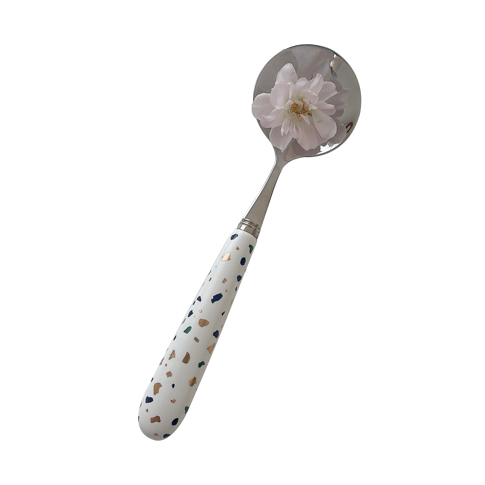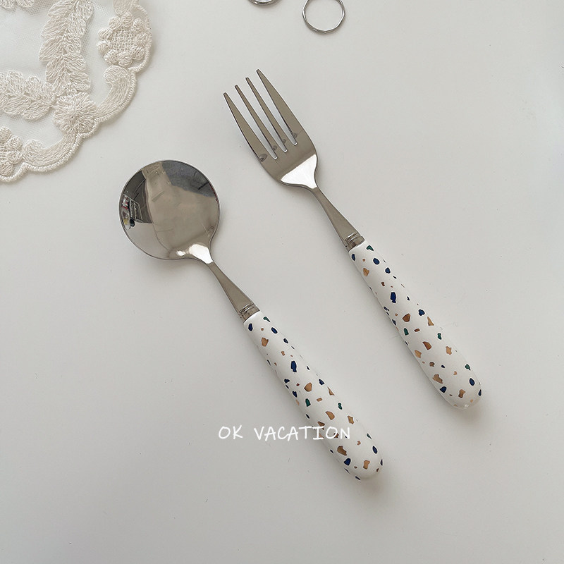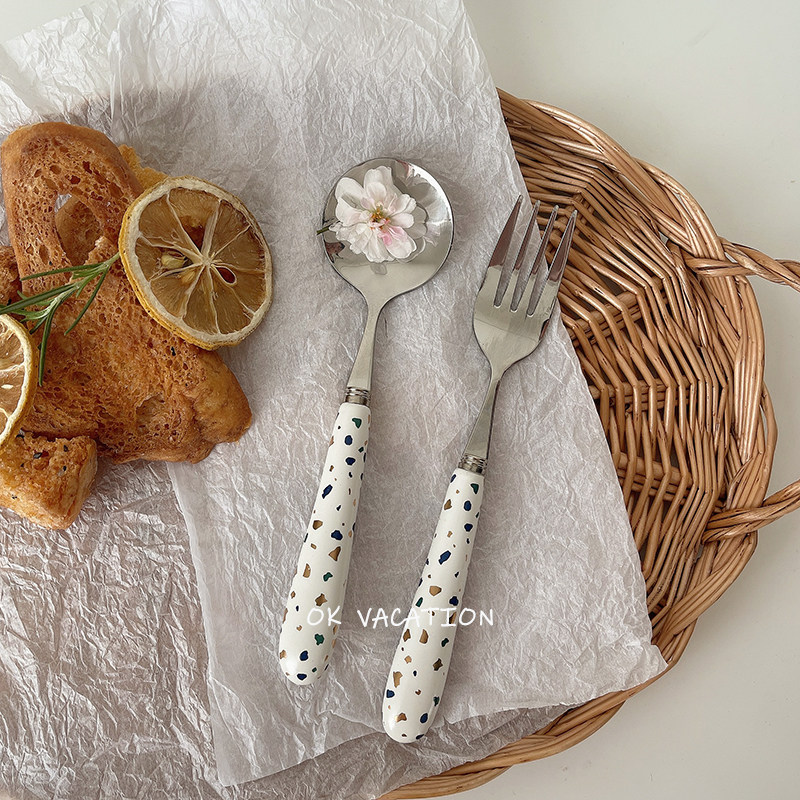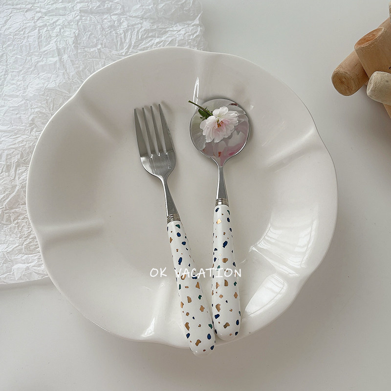 Korean style ins gravel pattern ceramic handle quartz stone paste gold flower stainless steel fork spoon set dessert salad fork