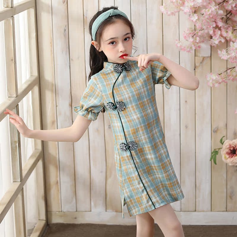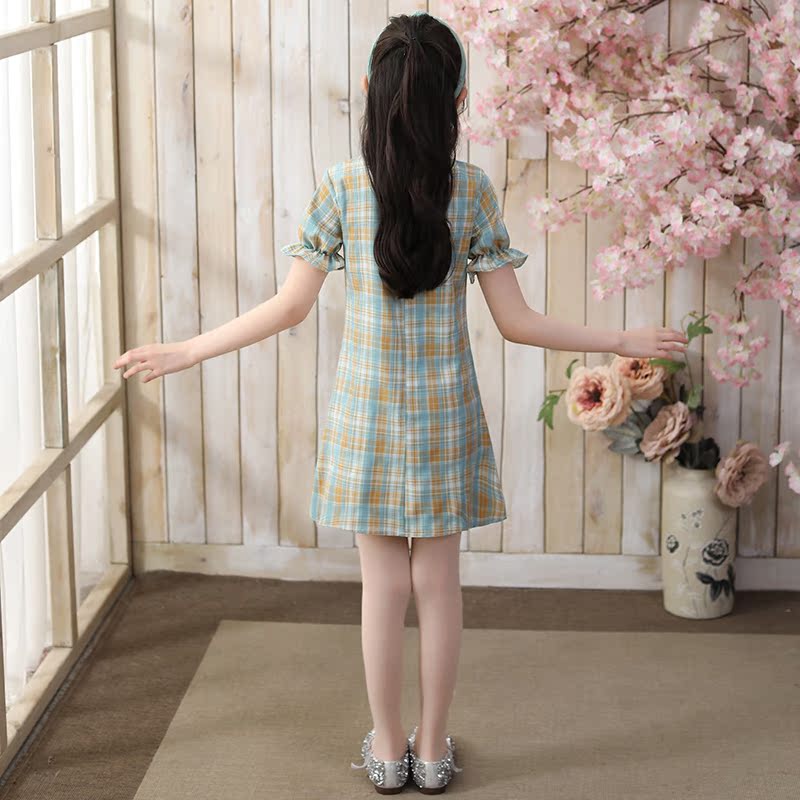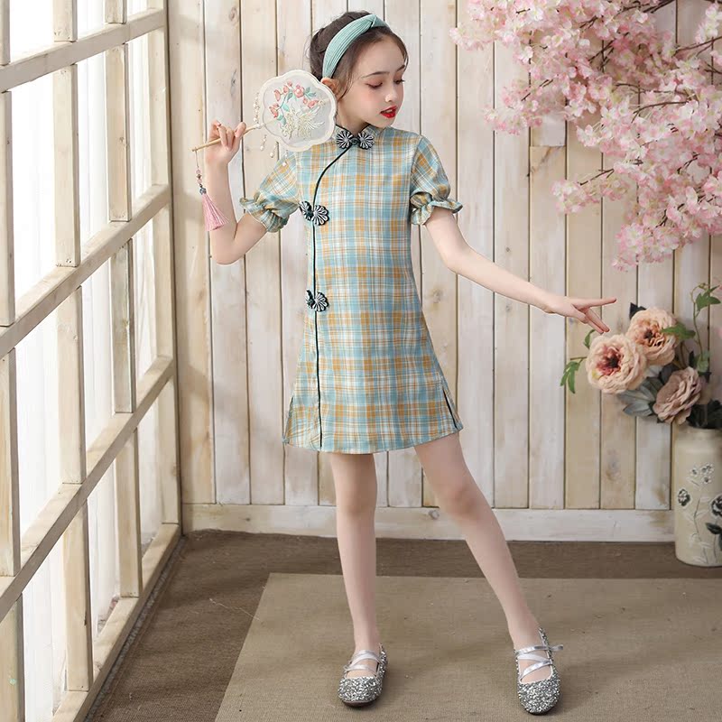Children's cheongsam little girl summer girl Chinese style princess dress Western style thin green plaid short-sleeved dress