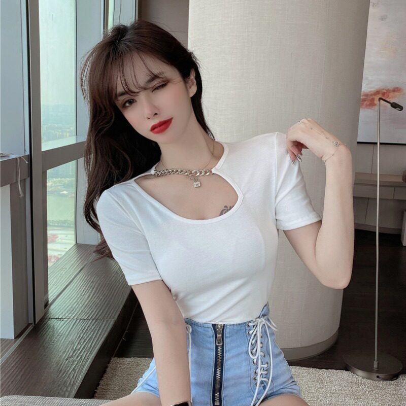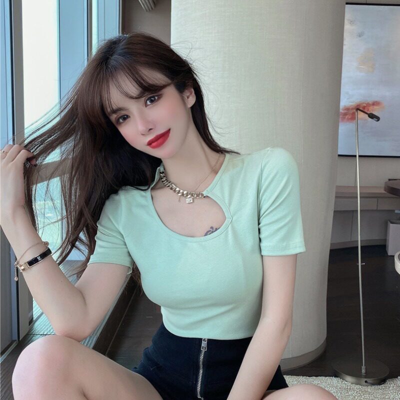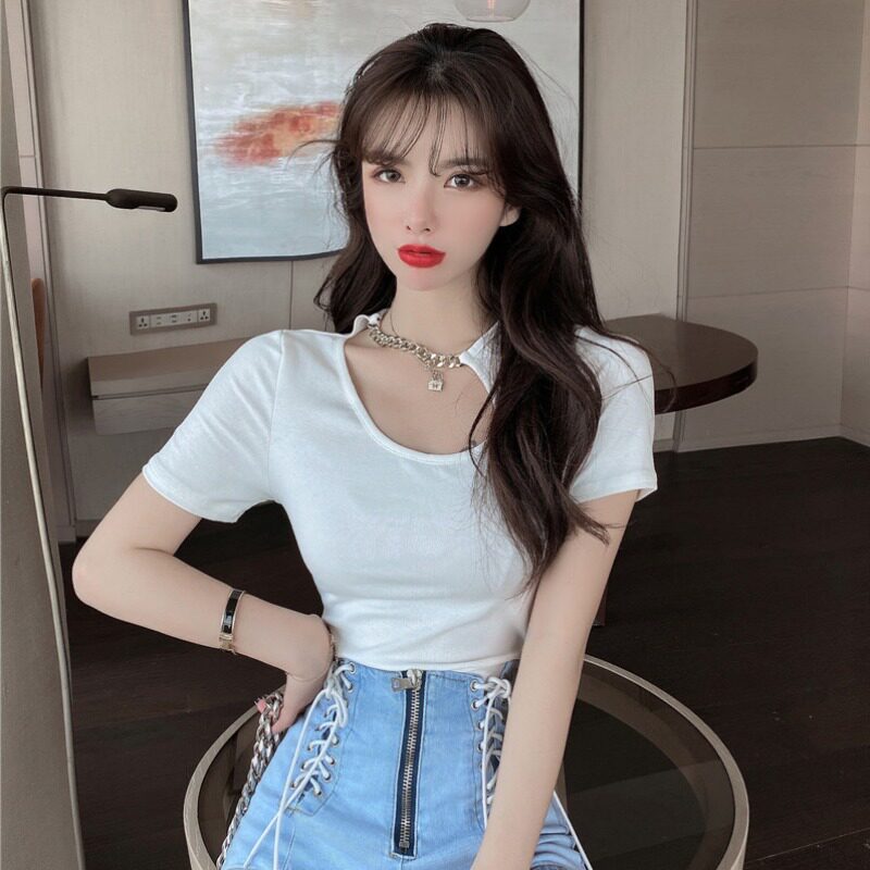 celine pianna short sleeve T-shirt female summer new design sensation small crowdchain hanging neck type collarbone short blouse