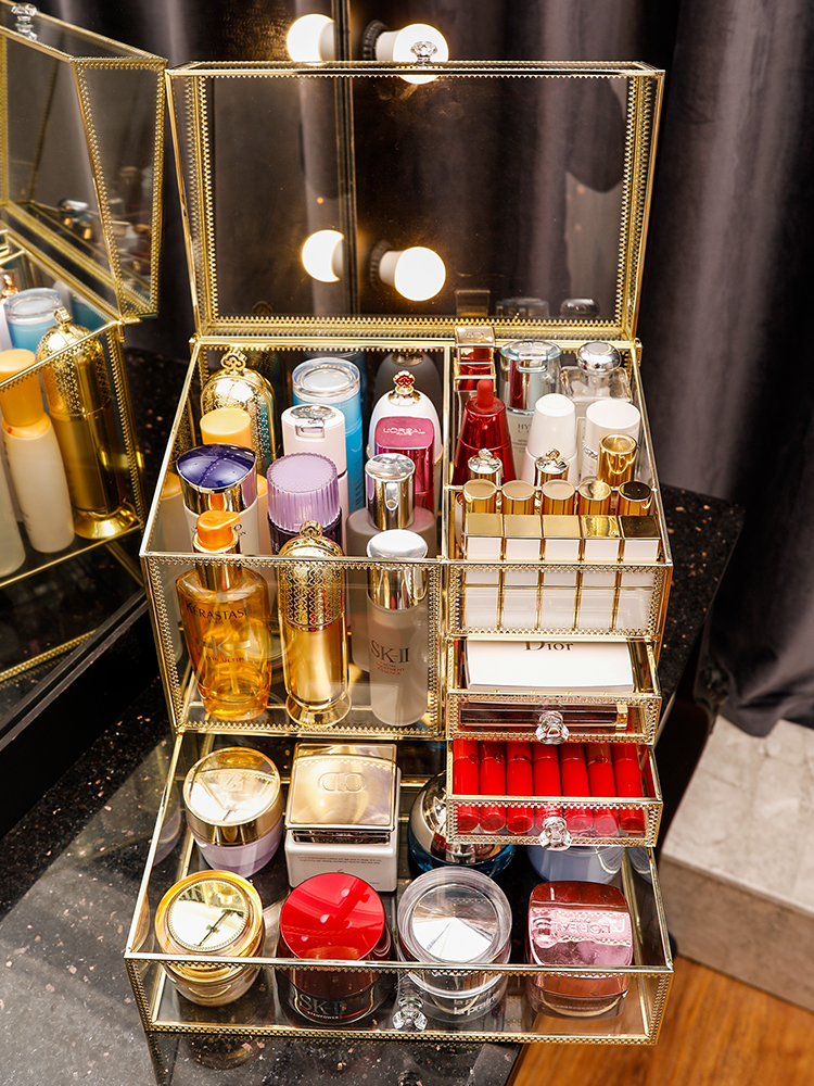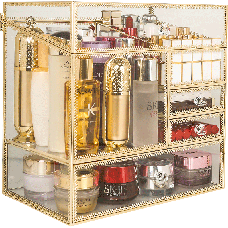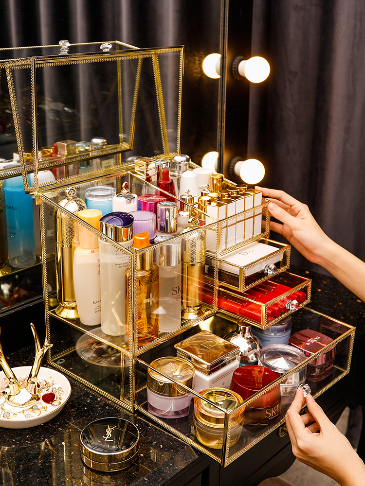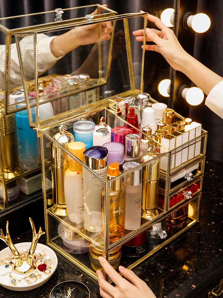 Copper glass cosmetic storage box advanced dust-proof lipstick makeup brush large-capacity desktop makeup rack light luxury