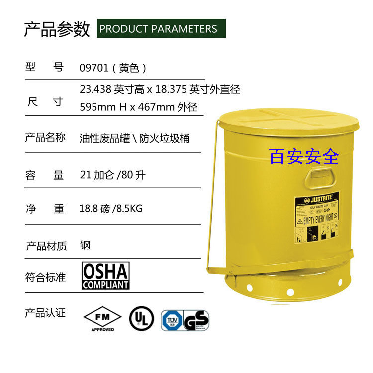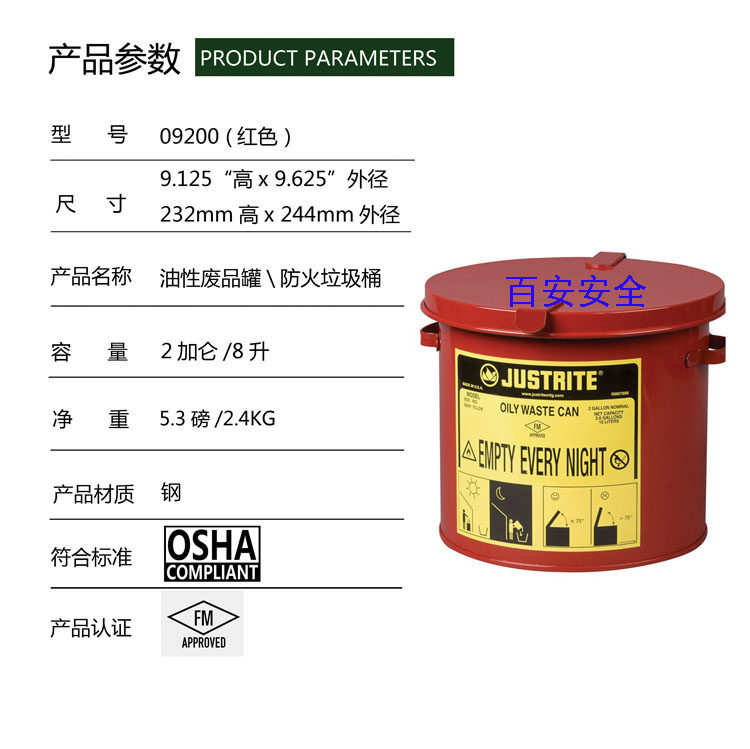 Justrite09100 laboratory factory fireproof and explosion-proof garbage can 09200 waste liquid collection barrel 09300