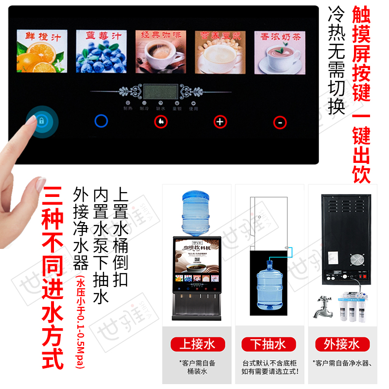 Desktop 4 cold and 4 hot (concentrated jam machine) Desktop 5 hot and cold (3 kinds of instant powder 2 kinds of jam) Vertical 5 cold and hot (3 kinds of instant 2 kinds of jam) Scan code desktop 5 cold and hot (3 kinds of instant 2 kinds of fruit