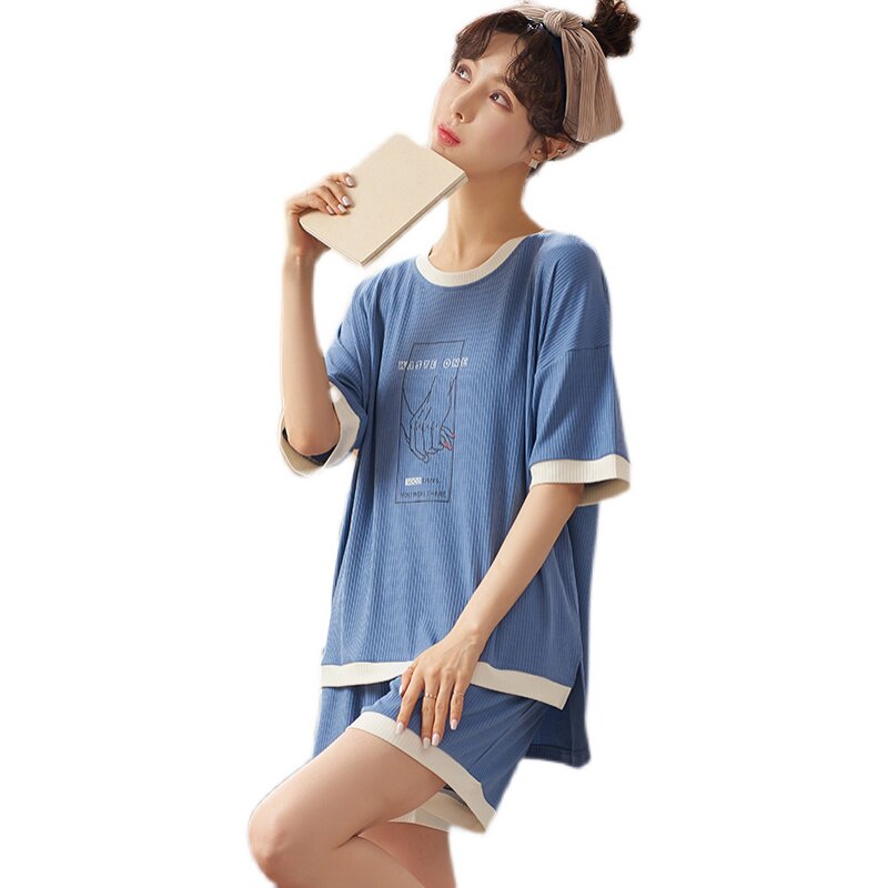 New Frontier Cotton] Pyjamas Female Summer Pure Cotton Short Sleeves Thin Loose Cute Sweet And Beautiful Exterior Wear Round Collar Home Suit Suit