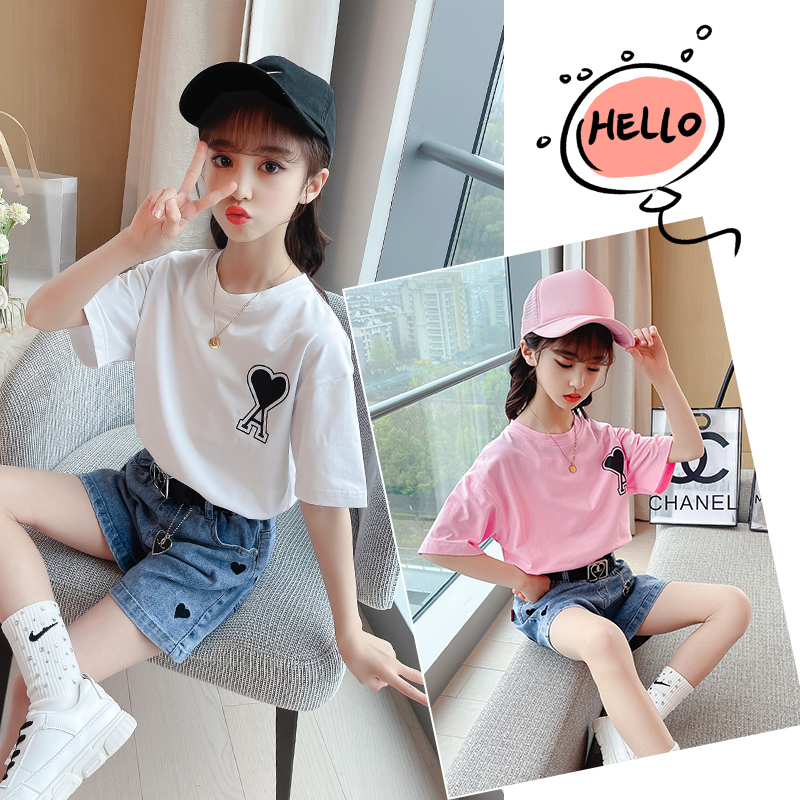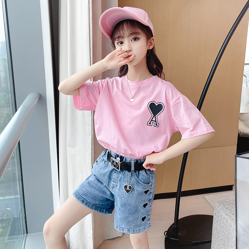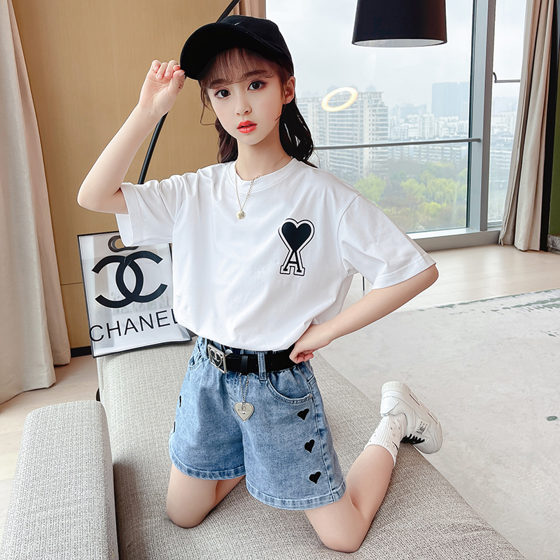 Girl Summer Clothing Suit Network Red Ocean Faction 2022 New Korean Version Children Summer Short Sleeve Denim Shorts Two Sets Tide