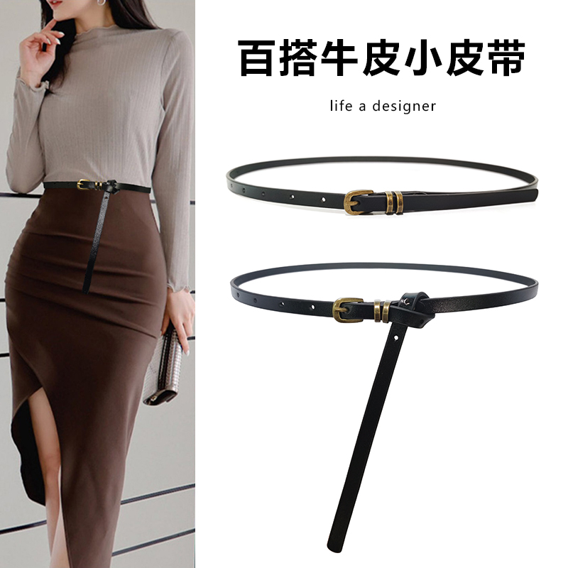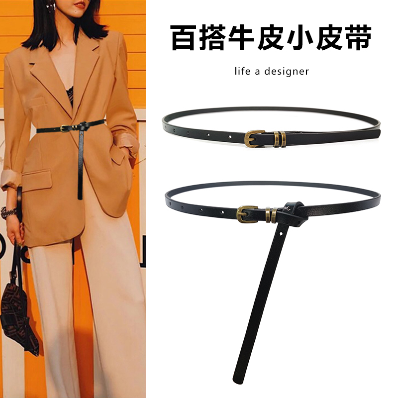 Cow leather retro small leather strap female dermis knotted thin belt 100 matched with skirt waist chain brief decorative shirt ins