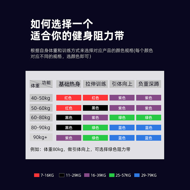 Light blue 0.64cm wide (pull 1~68Kg) red 1.3cm wide (pull 7~16Kg) black 2.2cm wide (pull 11~29Kg)