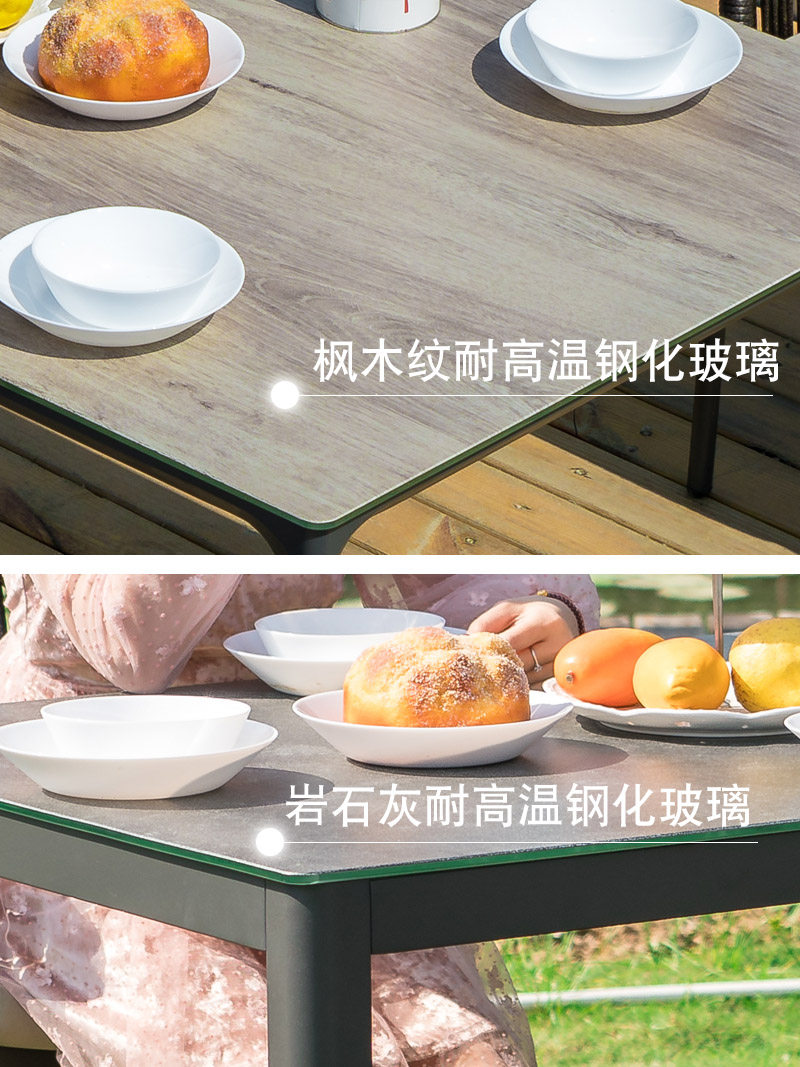 Tempered maple grain tempered glass long table (160*80) 4 chairs Rock gray tempered glass square table (120*80) 4 chairs Maple grain tempered glass square table 4 chairs Steel plate single leg round
