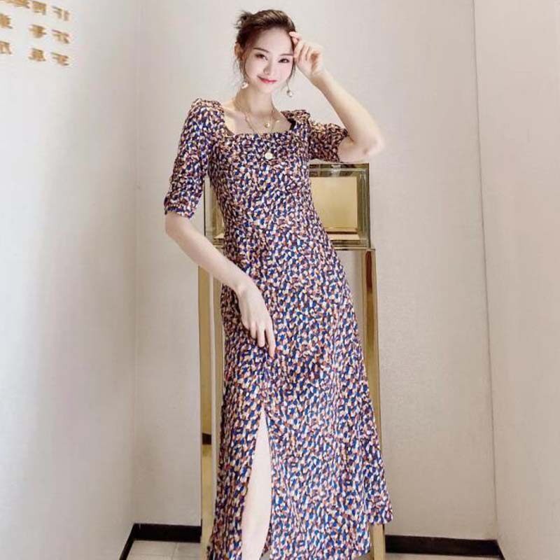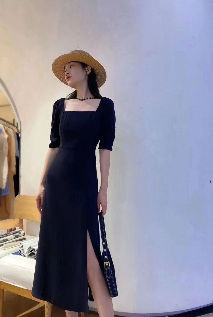 Women's dress Amasch new 2022 Summer autumn open fork with lean Hepburn square collar short sleeve foreign dress
