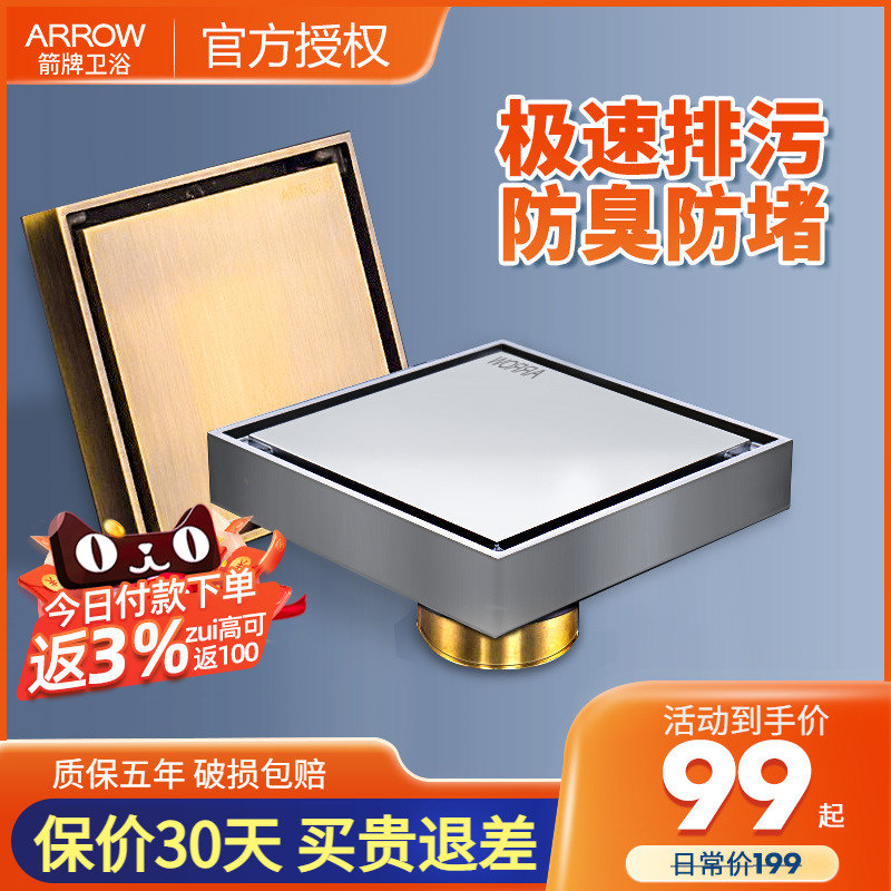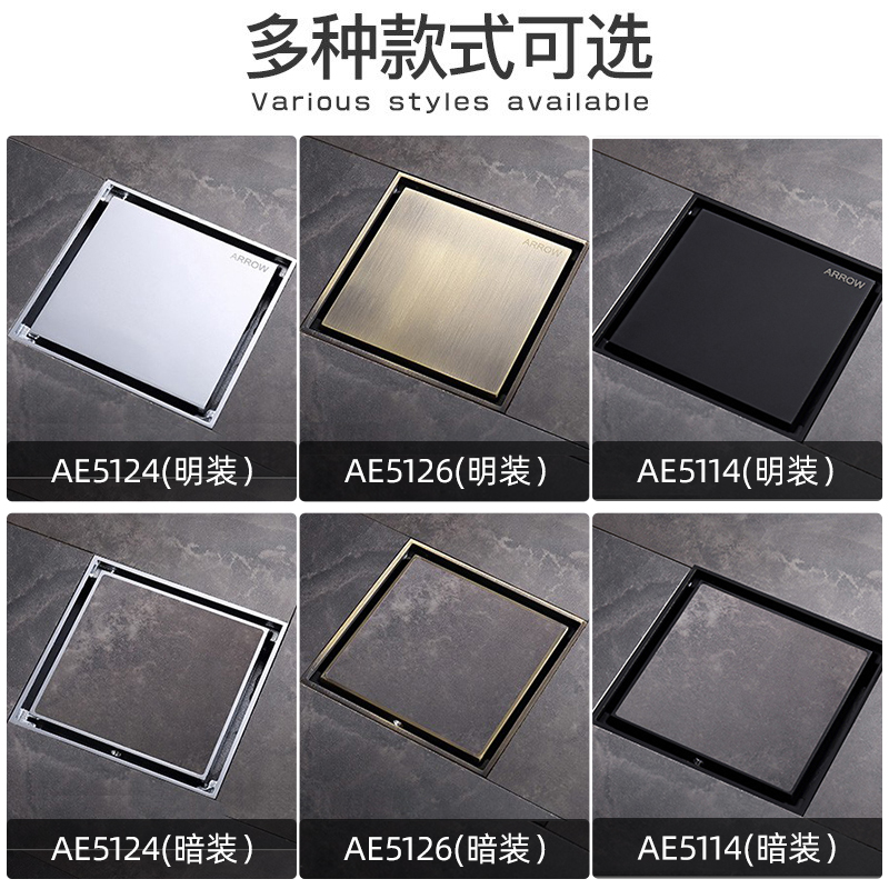 Arrow Sign Square Invisible Floor Drain Hide Floor Drain Makeup Room Sewer Deodorant Fine Copper Toilet Hair Anti-Clogging Floor Drain