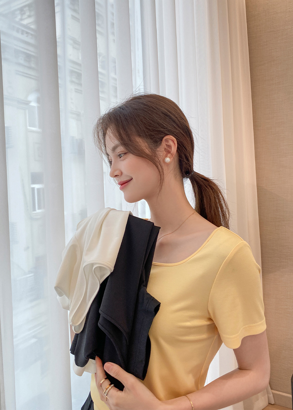 Lier Gaoding LRKS〖Square Neck Acetate T〗Temperament solid color cool design sense T-shirt summer square collar top women