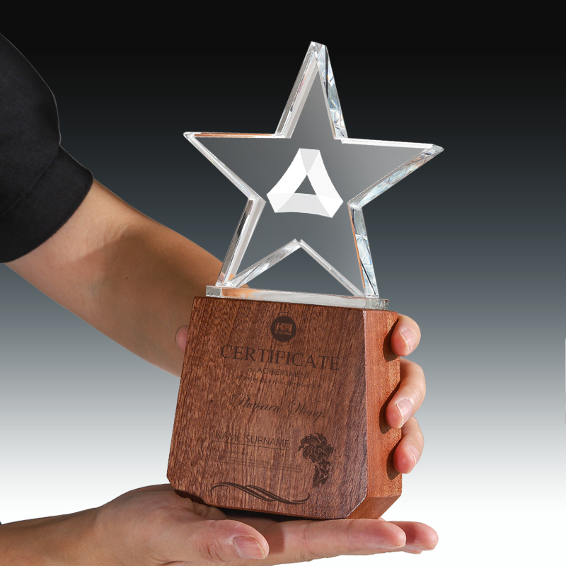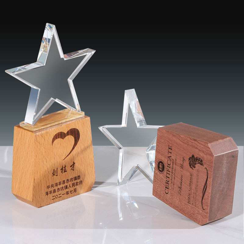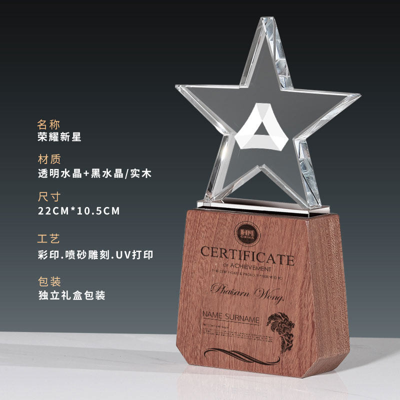 Five-pointed star solid wood trophy custom wood crystal medal custom authorization plate outstanding employee award pin crown engraving
