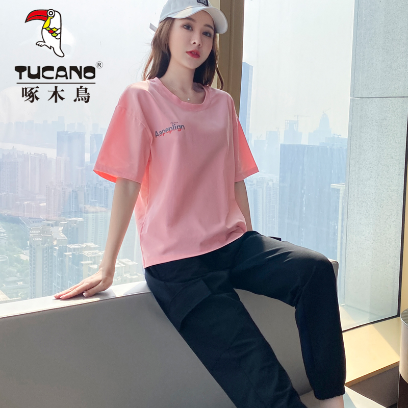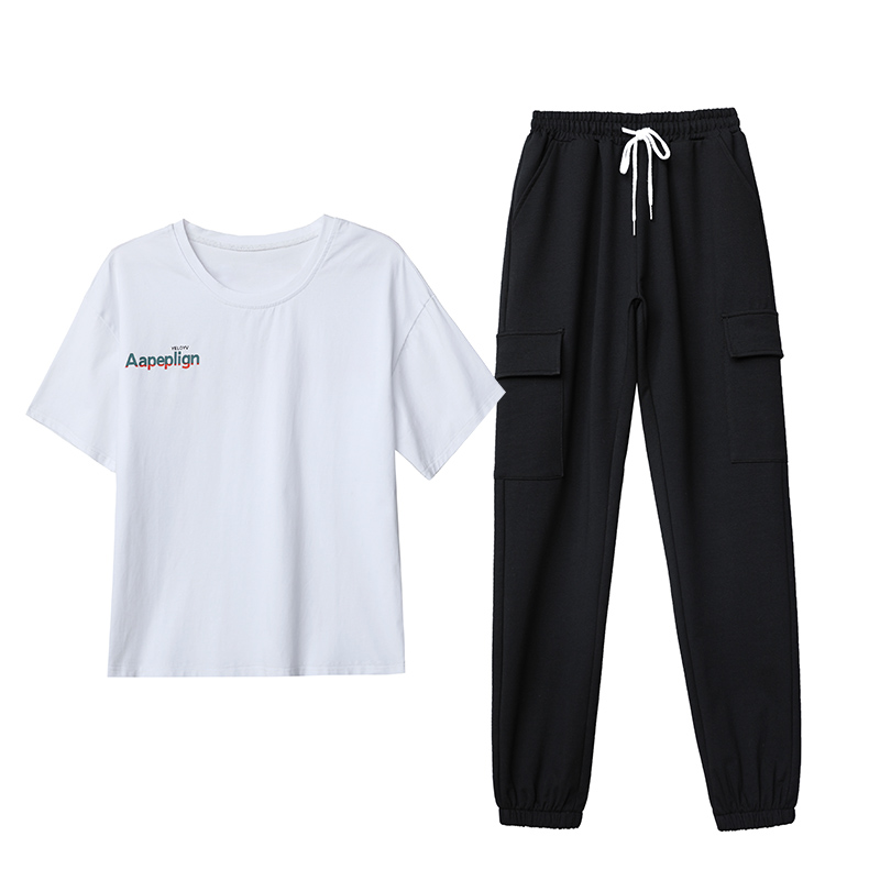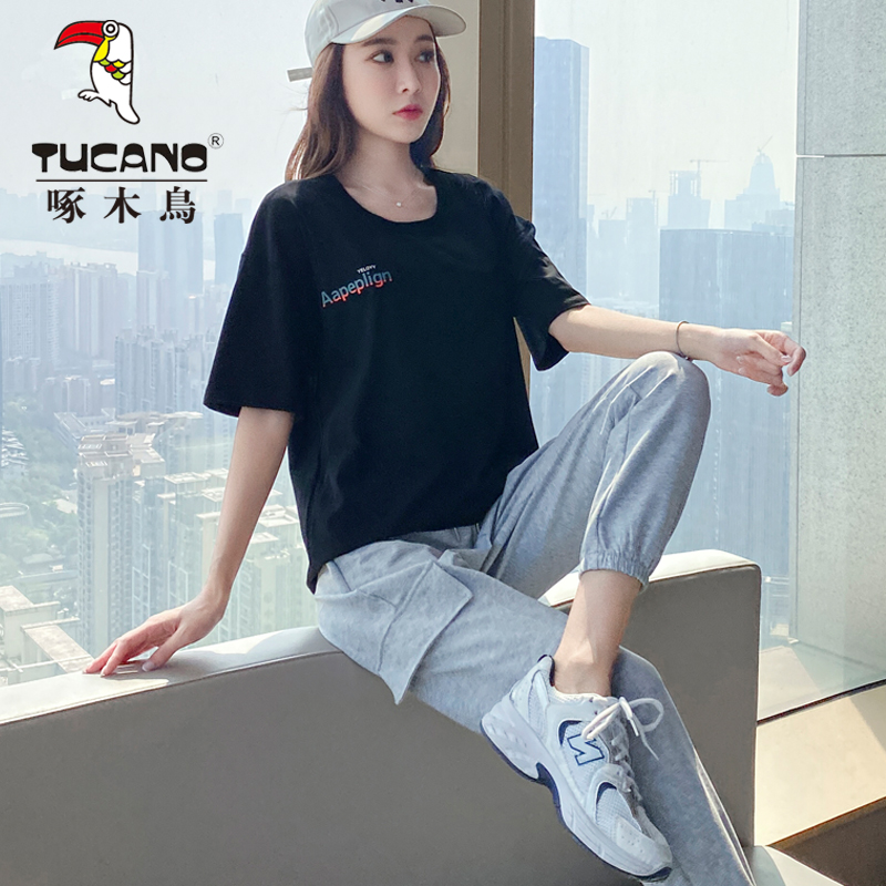 Peck Wood Pure Cotton Fashion Suit Women 2022 New Summer Short Sleeve Sports Clothes Middle School Students Leisure Two Sets Tide