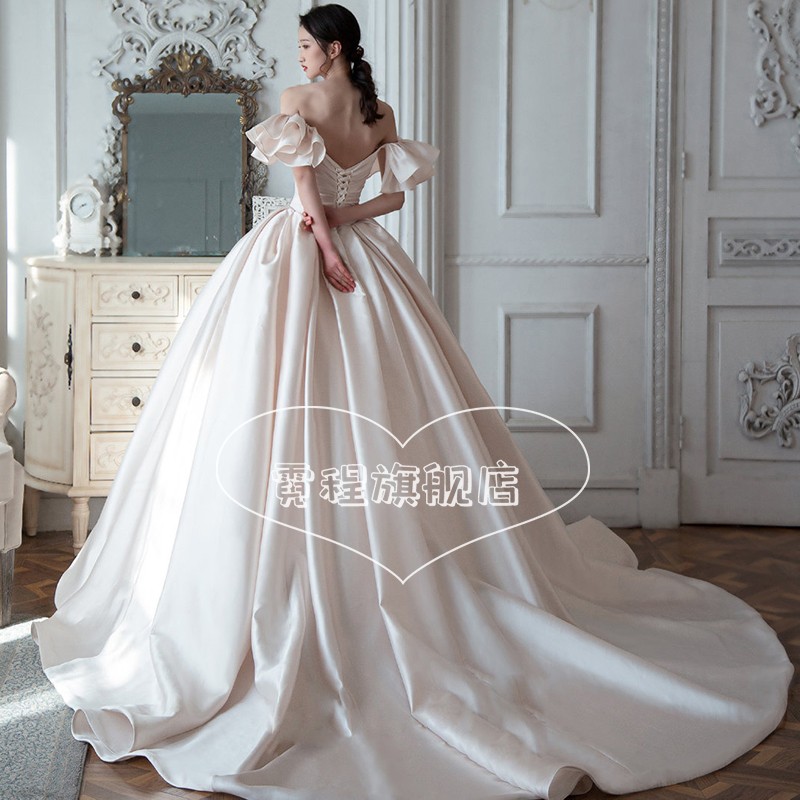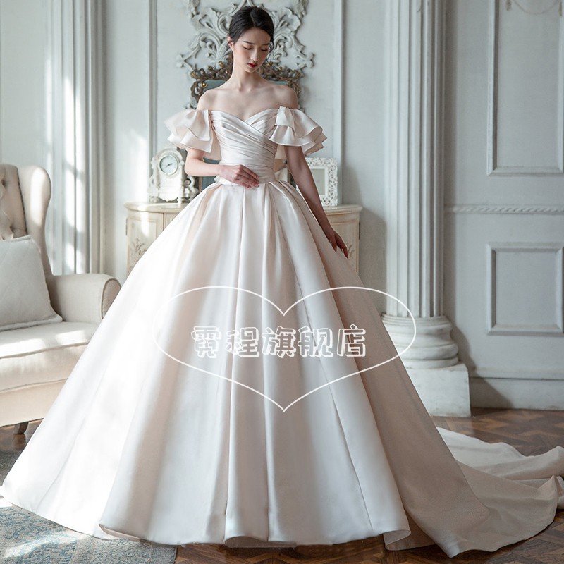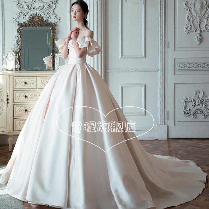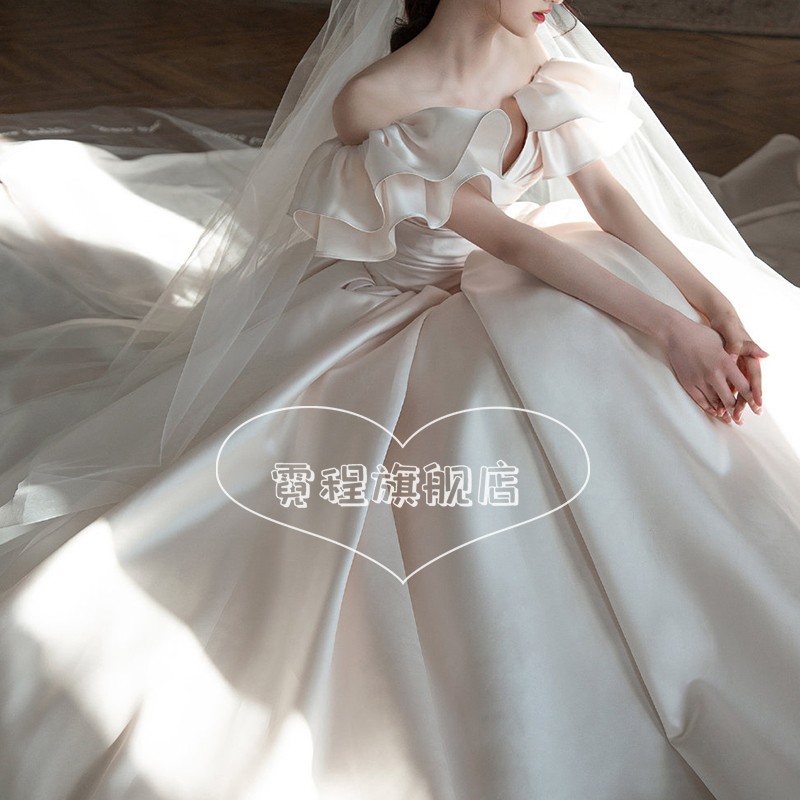 Satin light wedding gown 2022 new retro bridal style 2023 large trailing small child with a single shoulder