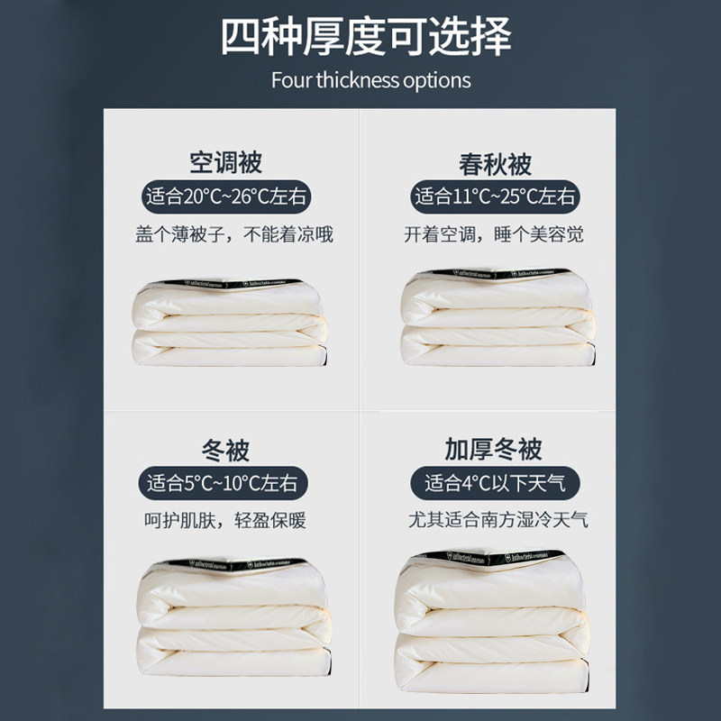 150x200cm summer cool quilt (about 2.6 kg room temperature above 20 °C) 150x200cm spring and autumn quilt (about 3.6 kg room temperature 11-25 °C) 150x200cm thickened winter quilt (about 5.6 kg room temperature 5-15 °C) 180x220cm summer cool quilt (about 3 kg room temperature above 20 °C) 180x220cm spring and autumn quilt (about 4 kg room temperature 20-25 °C) 180x220cm winter quilt (about 6 kg room temperature 11-25 °C) 180x220cm thickened winter quilt (about 8 kg room temperature 5-15 °C applicable) 200x230cm summer cool quilt (about 3.2 kg room temperature above 20 °C applies) 200x230cm spring and autumn quilt (about 4.2 kg room temperature 11-25 °C applicable) 200x230cm spring and autumn quilt (about 6.2 kg room temperature 10-15 °C) 200x230cm thick winter quilt (about 8.2 kg room temperature 5-15 °C) 200x230cm extra thick winter quilt ( Approx. 10.2 kg room temperature below 5 °C) 220x240cm spring and autumn quilt (about 4.5 kg room temperature 20 °C applies) 220x240cm spring and autumn quilt (about 6.5 kg room temperature 11-25 °C applicable) 220x240cm thick winter quilt (about 8.5 kg room temperature 5-15 °C applicable) 220x240cm extra thick winter quilt (about 10.5 kg room temperature below 5 °C)