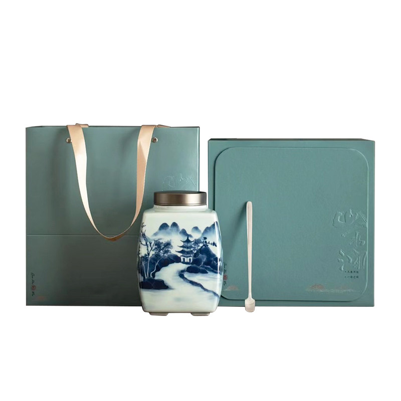 High-grade blue and white landscape pot universal half-pound ceramic tea pot Longjing Biluochun white tea Maojian tea packaging box
