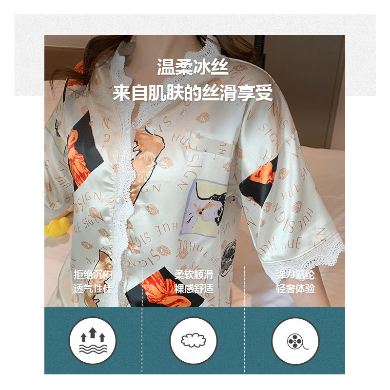 Pajamas Ladies Spring and Autumn Silk Short Sleeve Cardigan Jacket Korean Version Simulated Silk Can Be Wearable Home Wear Korean Version Two-piece Suit