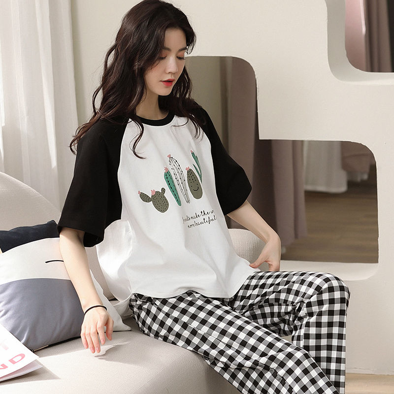 Cotton Pyjamas Woman Summer Thin style short sleeves Long pants two-piece style suit Spring and autumn day new cute stay-at-home clothes can be worn out