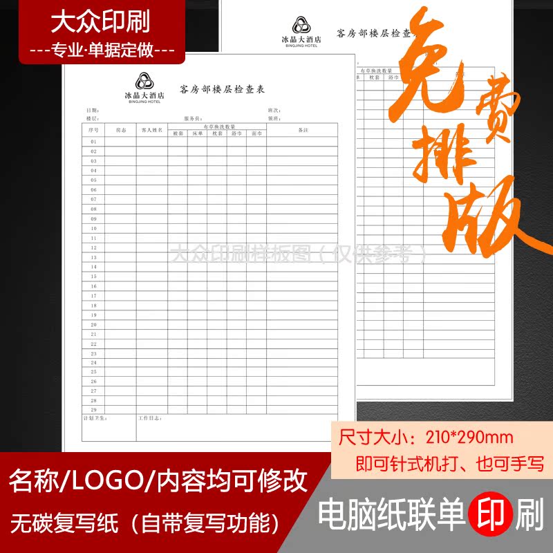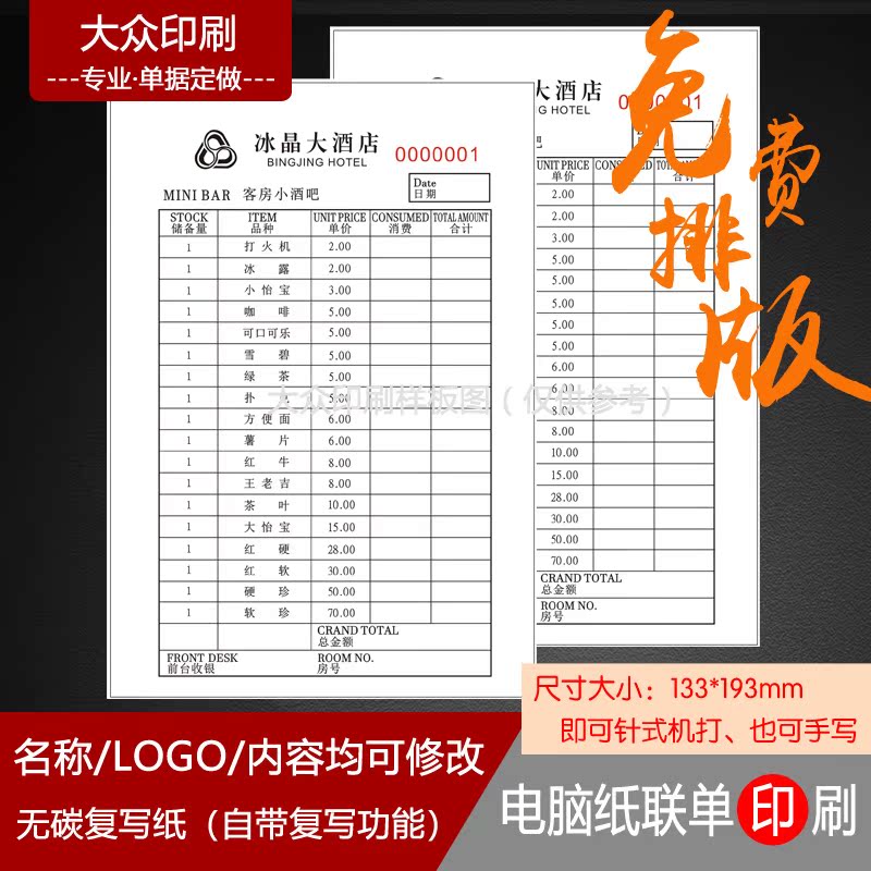 Customized hotel receipt deposit single passenger accommodation registration form machine printing hotel single printing room consumption list order