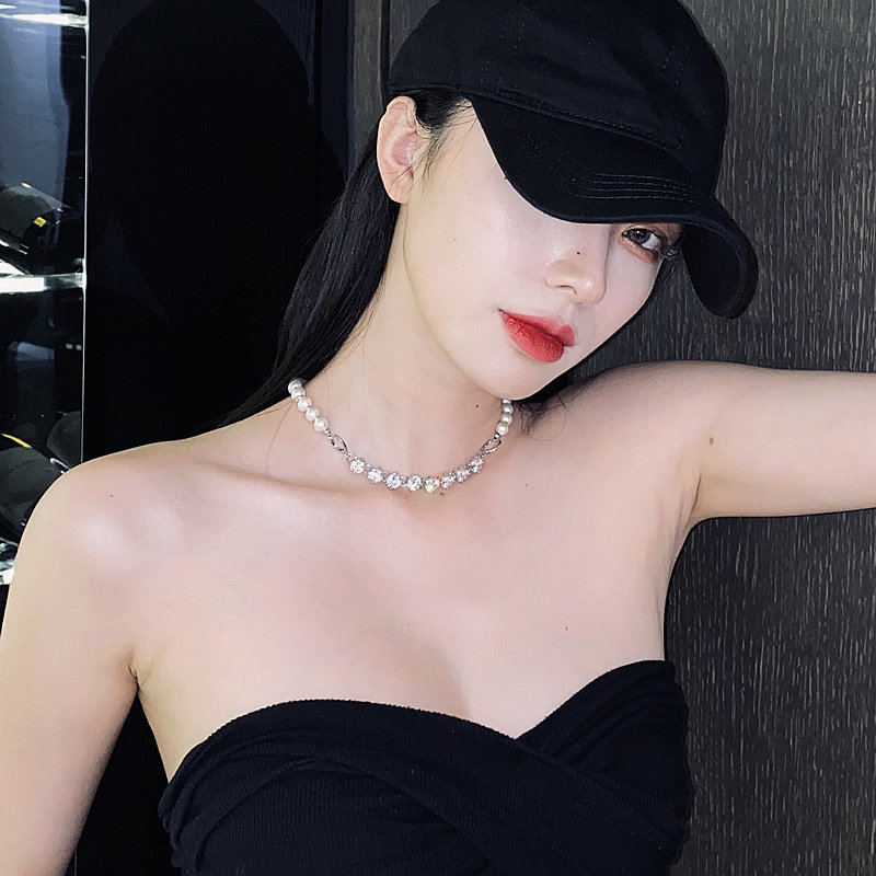 (End) Niche design sense imitation pearl stitching rhinestone necklace men and women hip hop ins net red tide collarbone chain