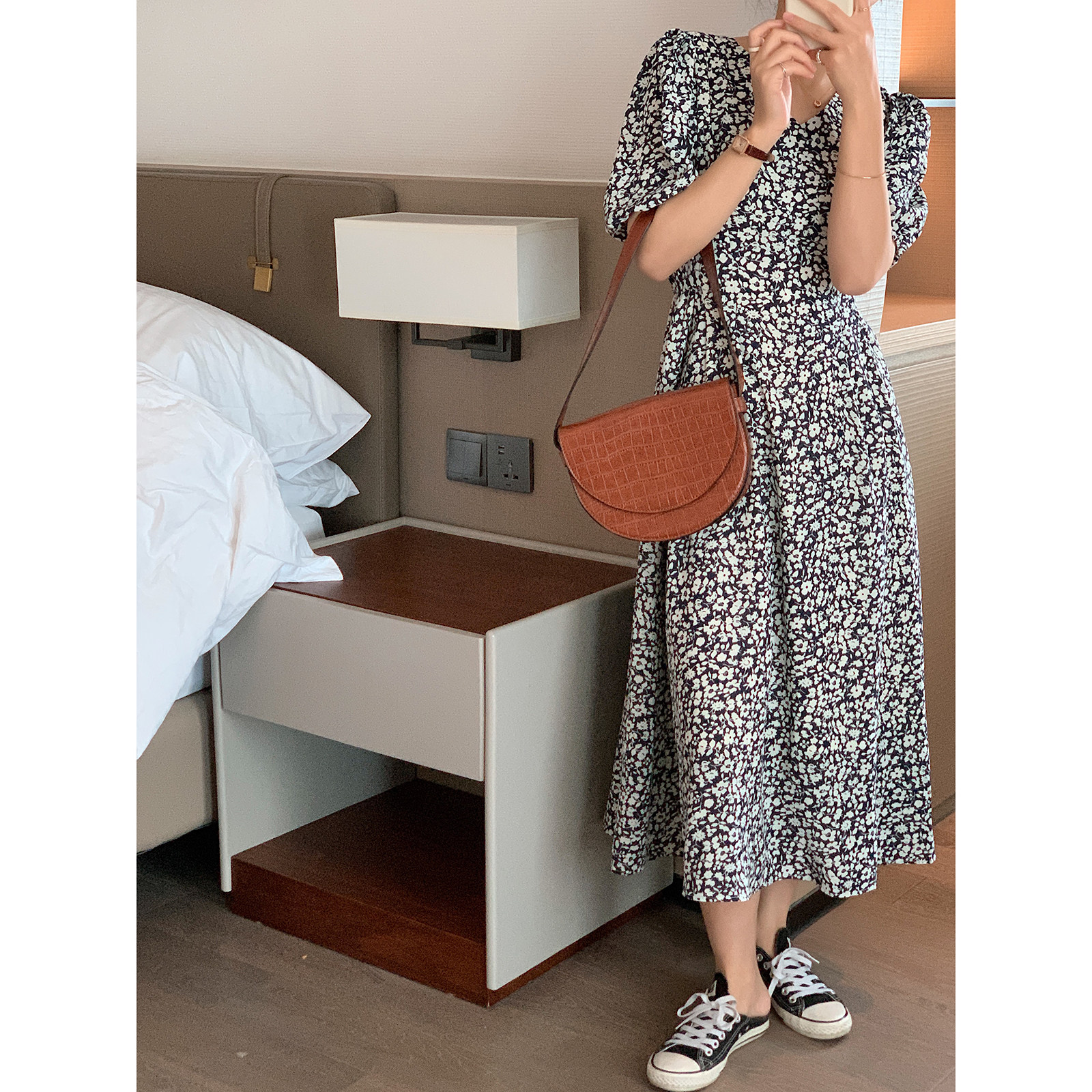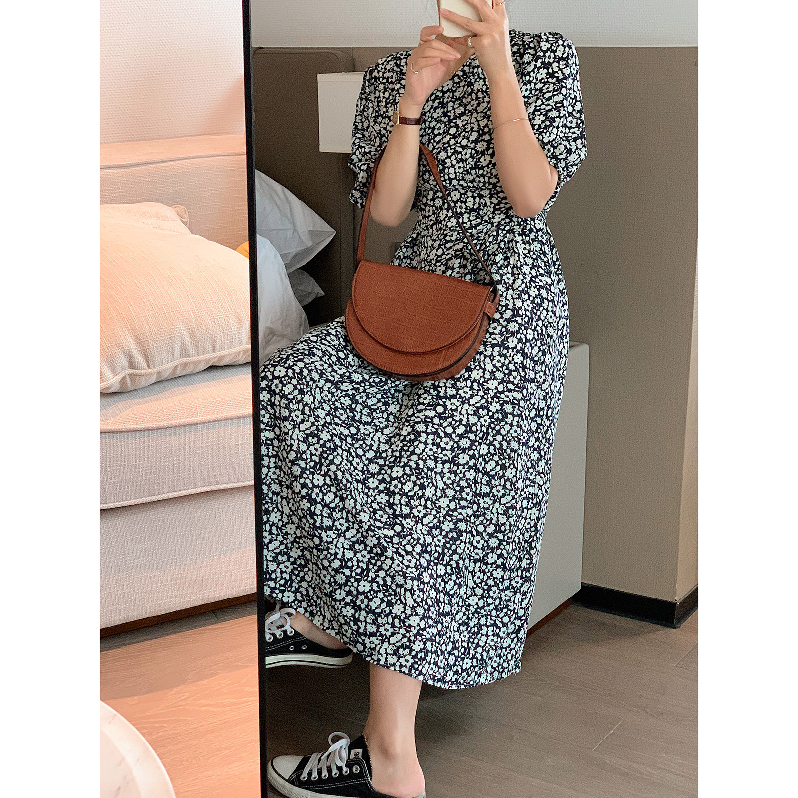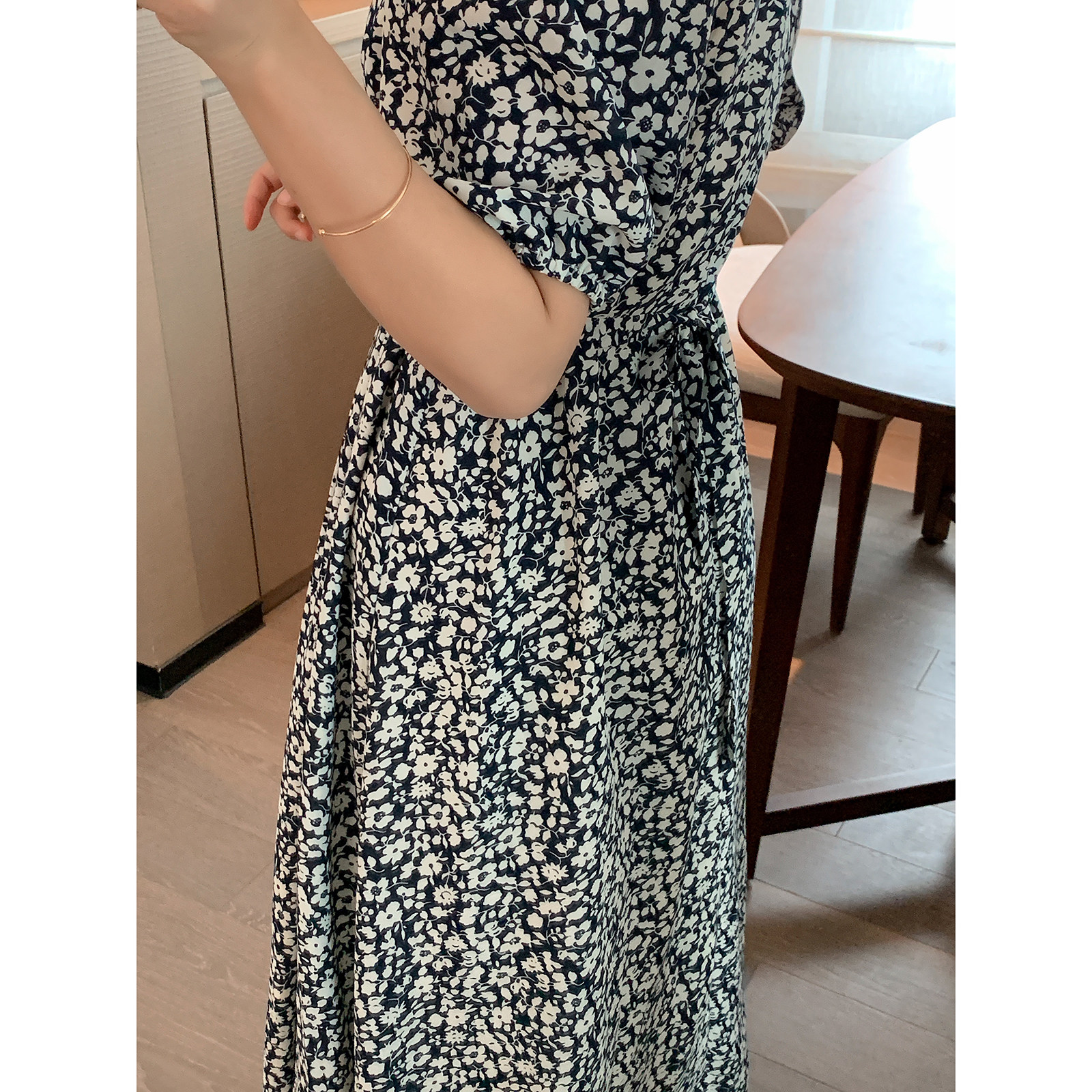 Foreign dress lady summer 2022 new cashew slim fit slim V collar foam cuff style gentle temperament blue Chopped Flowers Skirt