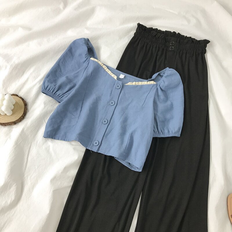 Fashion Foreign Pie Ice Silk Broadlegged Pants Summer New Suit Square Collar Short Sleeve Blouses Small Sub high two sets