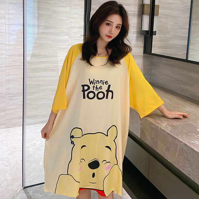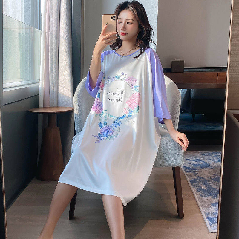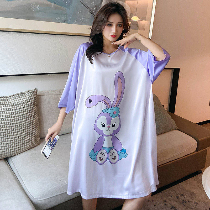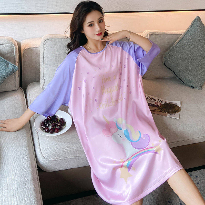 Sleeping Skirt Woman Summer Ice Silk Short Sleeve Thin cute cartoon student skirt net red popcorn Silk Pyjamas women Summer