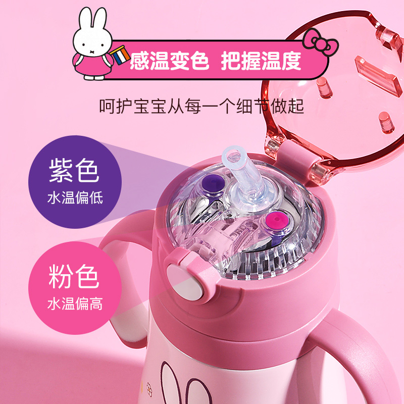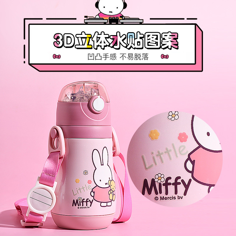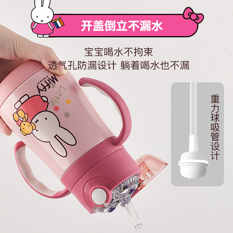 Miffy children's insulated water cup with straw dual-use infant baby drinking water learning drinking cup Go out to carry the kettle