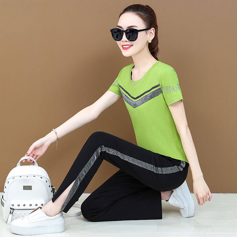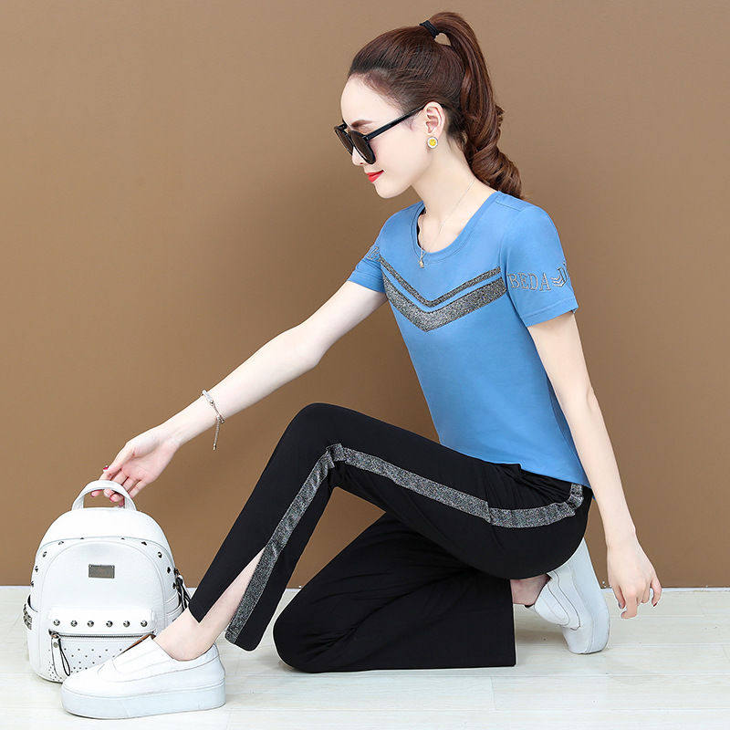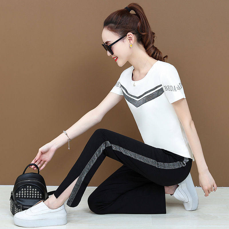 Ice-silk pure cotton small sub-display high fashion wide leg pants two-piece style suit Women's summer 2021 New sport Leisure