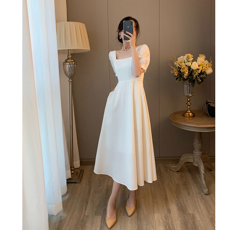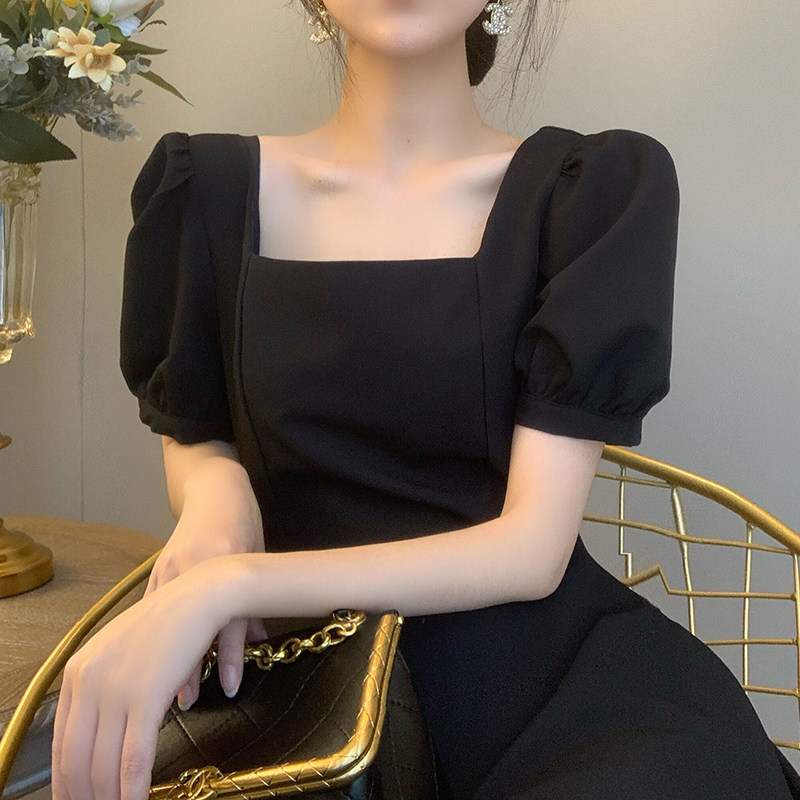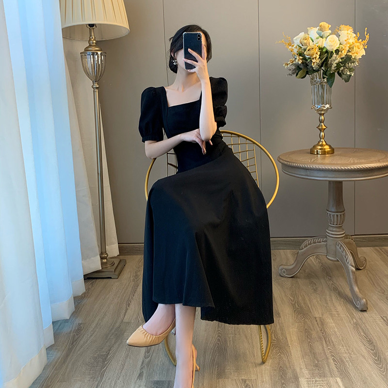 Black dress female 2022 summer new square collar French retro Hepburn style temperament slim slim dress