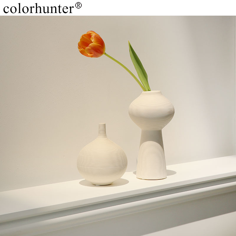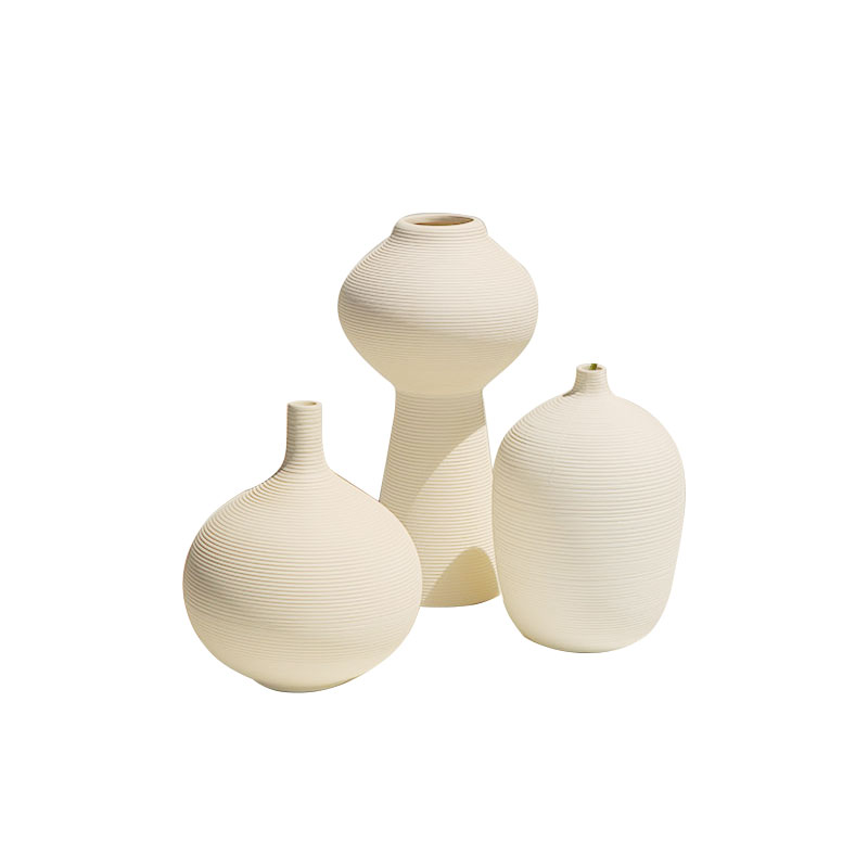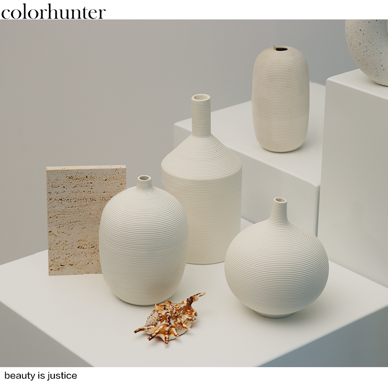 Threaded vase A threaded vase B threaded vase C threaded vase D threaded vase E circular vase White bottom black dot round vase Green simulated sharp leaf plant two