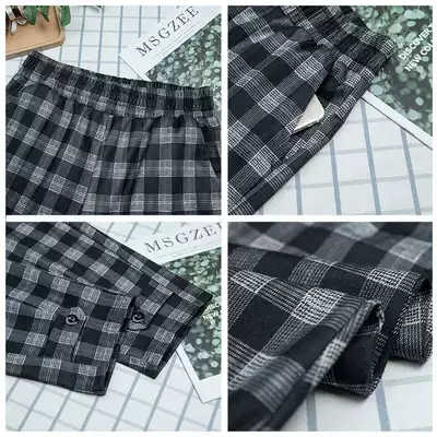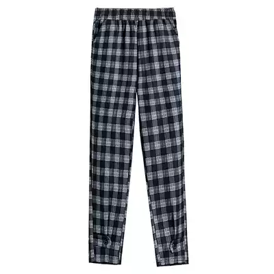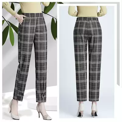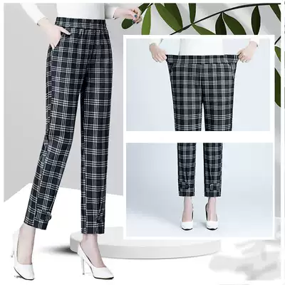 2021 middle-aged and elderly women's pants summer thin ice silk elastic nine-point pants mom plaid pants elastic waist loose