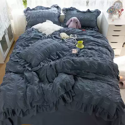 Korean version of lazy wind afternoon dark blue waffle bed four-piece seersucker breathable household double quilt cover sheets