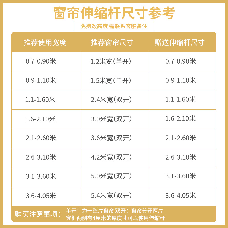 (Punching free telescopic rod) height can be shortened Use range 0 7-0 9 meters - Curtain height 1 5 Single opening use range 0 7-0 9 meters - Curtain height 2 0 Single opening use range 0
