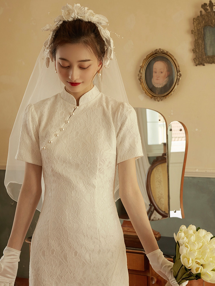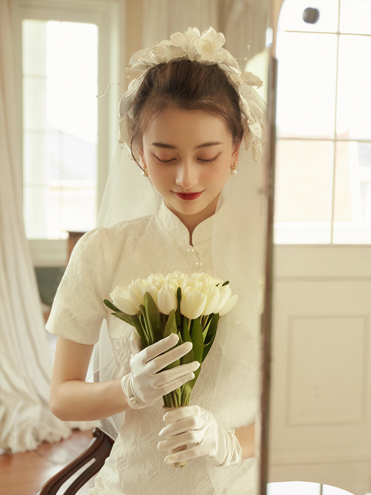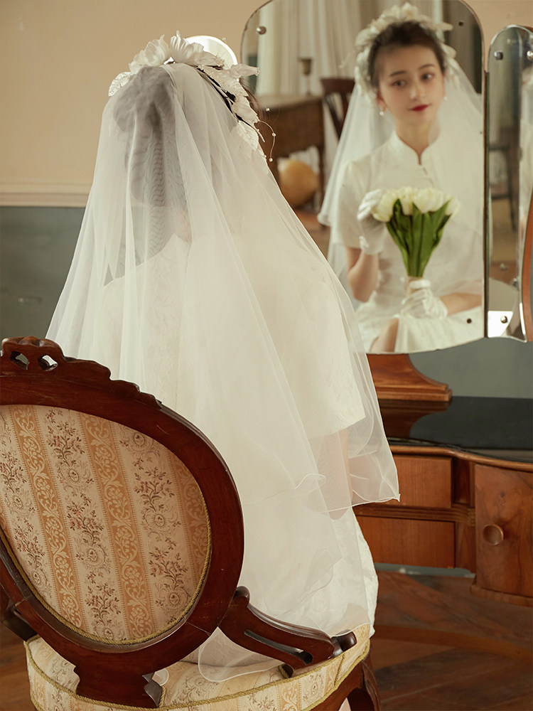 Cerfmia deer Miya handmade camellia retro French bride short veil photo custom show small face