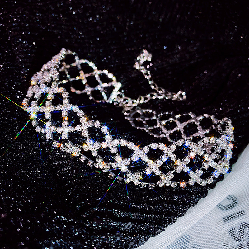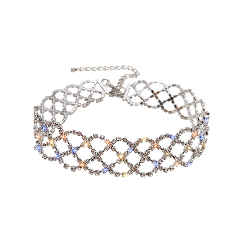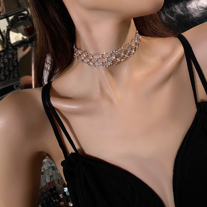 European and American super sparkling silver beautiful water drill grid neck chain short choker lock bone chain female ornament wide version necklace-Taobao