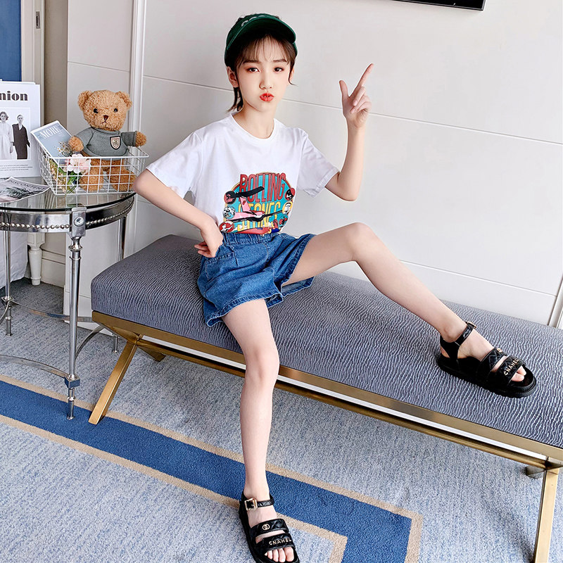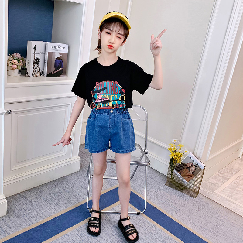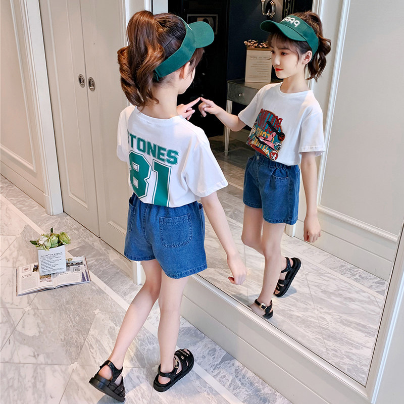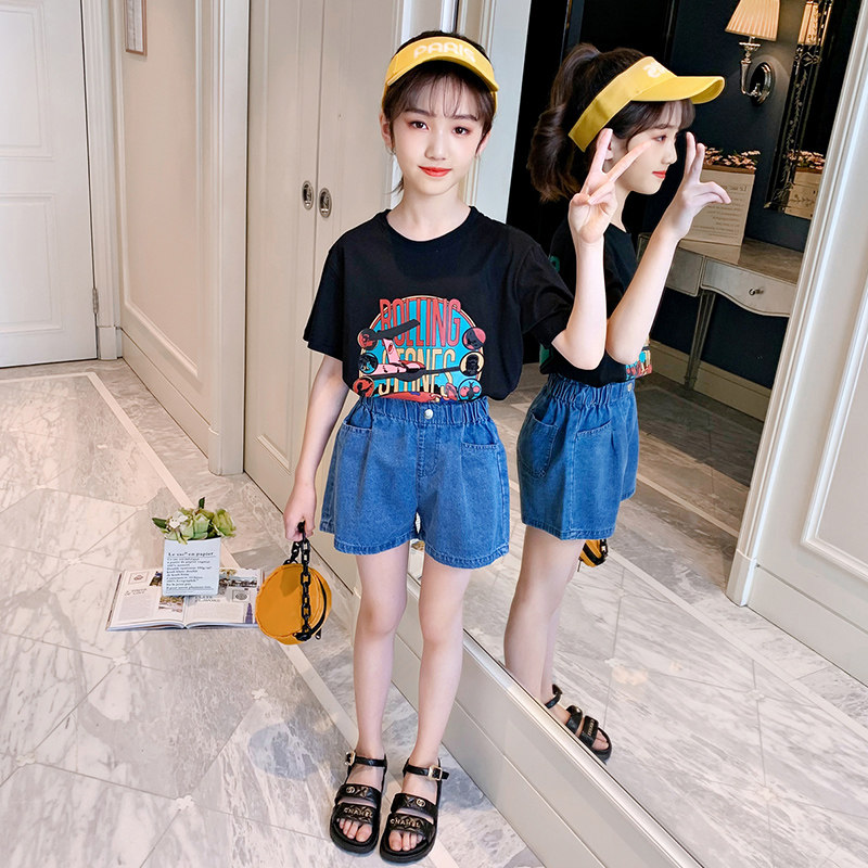 Girl Summer Clothing Online Red Suit Foreign Pie 2022 New Korean Version Children Summer Short Sleeve Denim Shorts Two Sets Tide