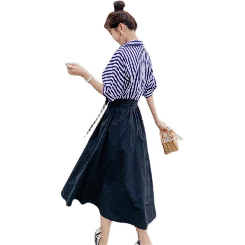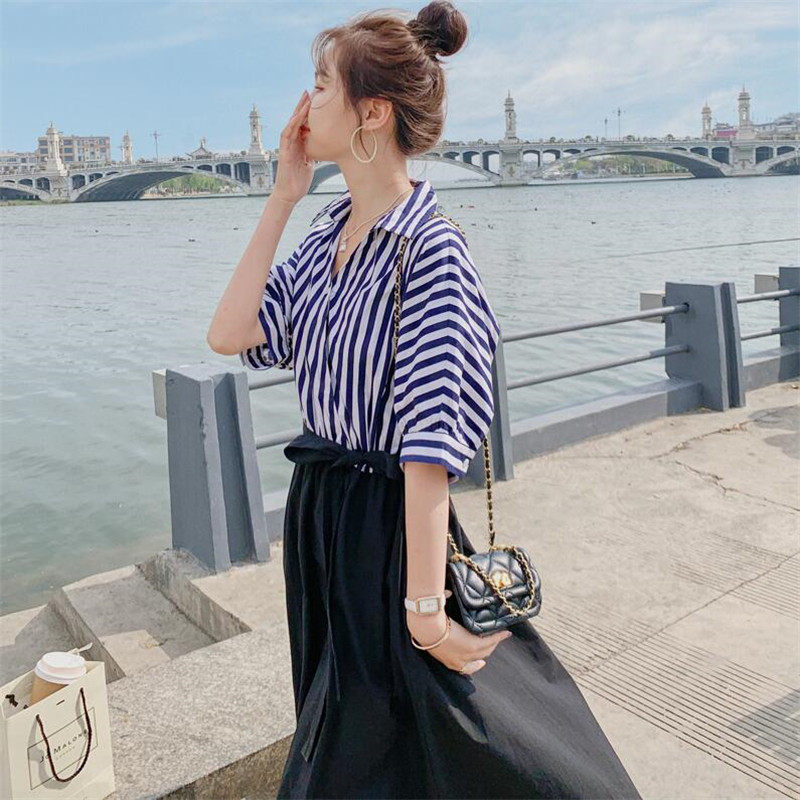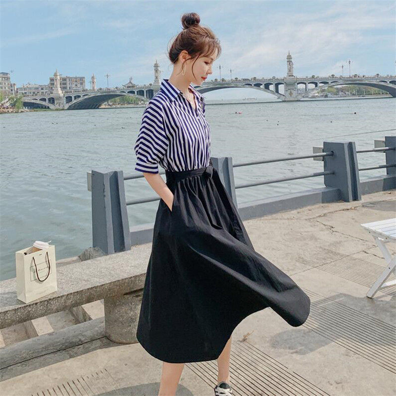 VOGCHAR shirt collar stitching temperament Hepburn style dress women 2021 new summer Hong Kong style loose mid-length skirt